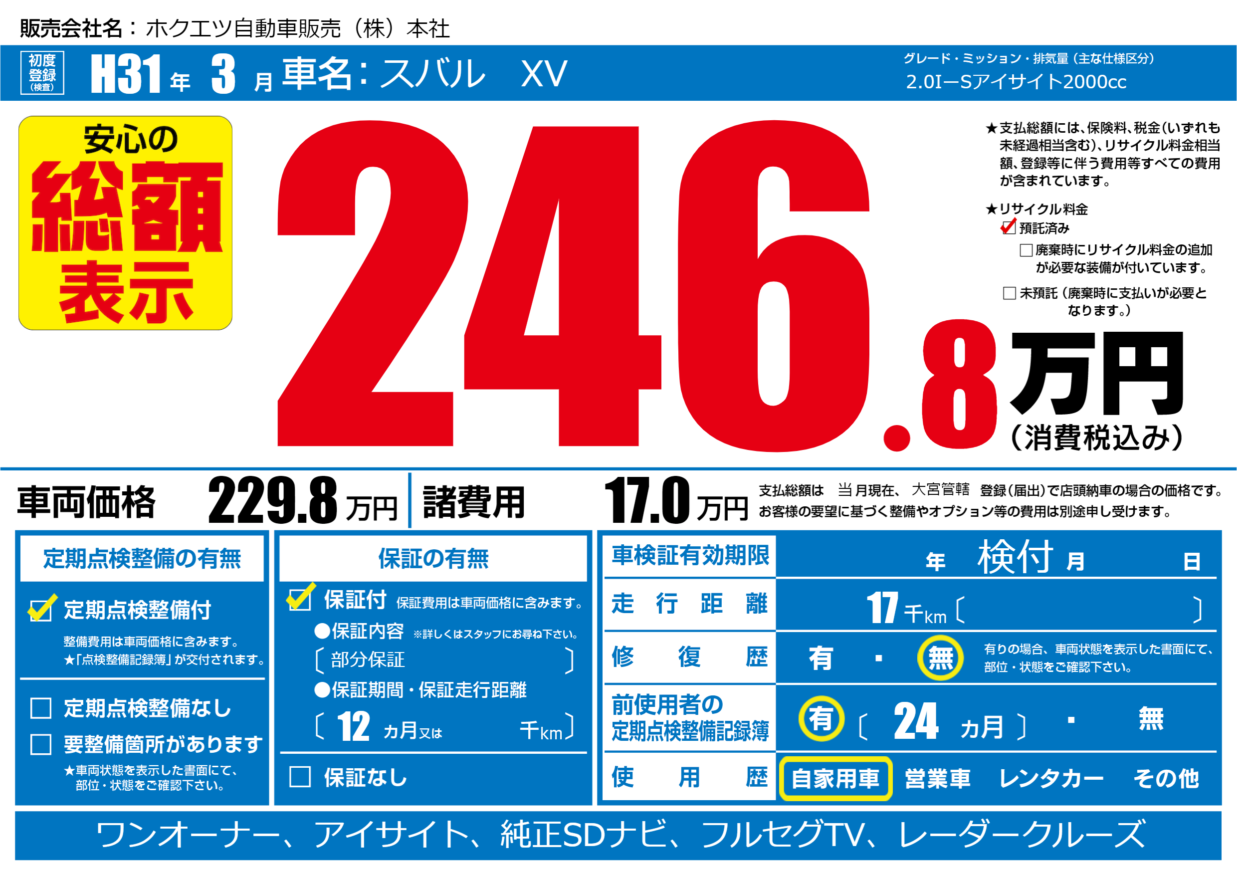 | 車名 | スバル XV | グレード ミッション 排気量 |