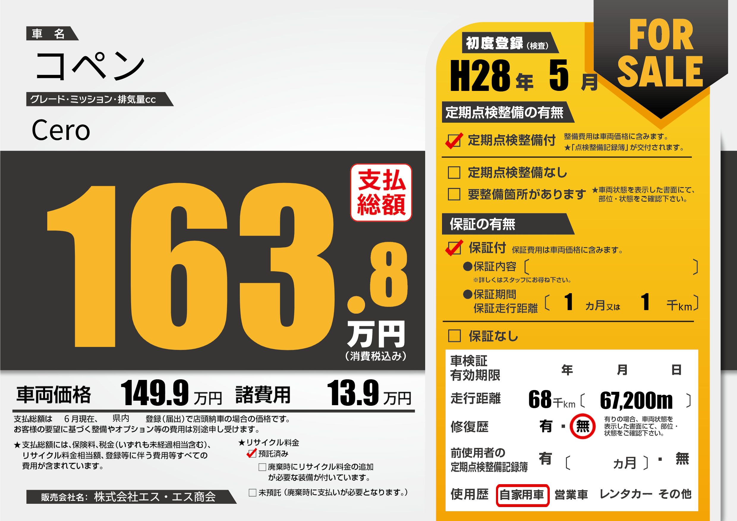 | 走行キロ | 6.8万km | 初年度登録 | H28年5月 |
