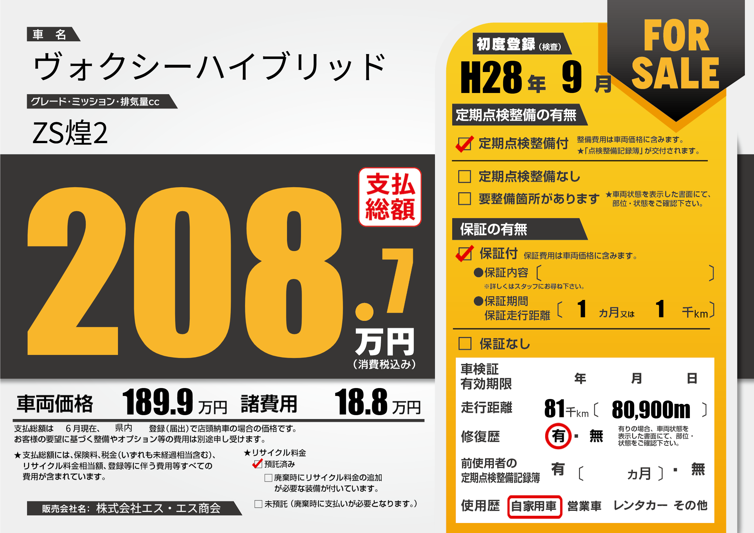 | 走行キロ | 8.1万km | 初年度登録 | H28年9月 |