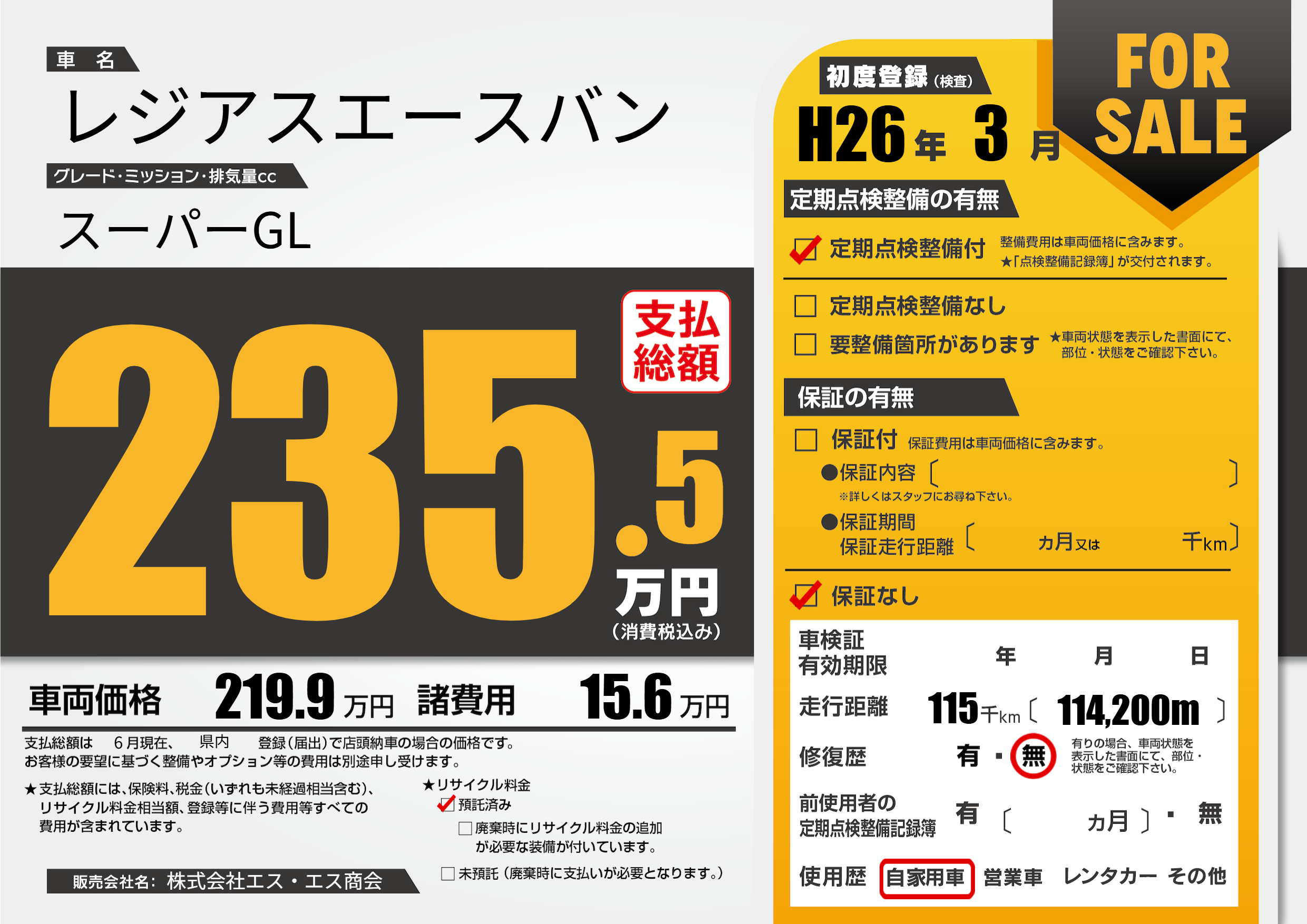 | 車名 | レジアスエースバン | グレード ミッション 排気量 |