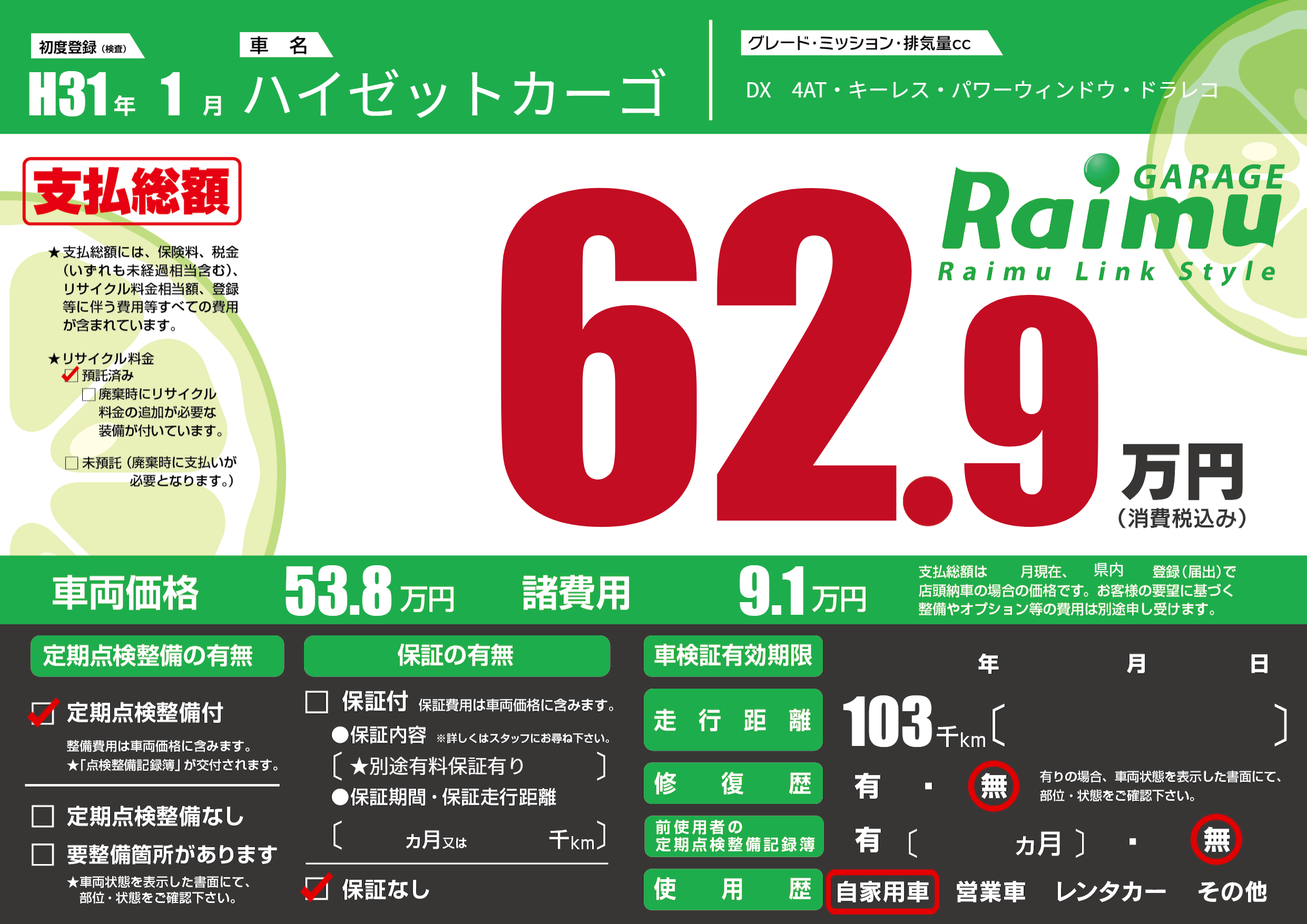 保証なし 保証内容(★別途有料保証有り) ---ヶ月または()千kmまで |