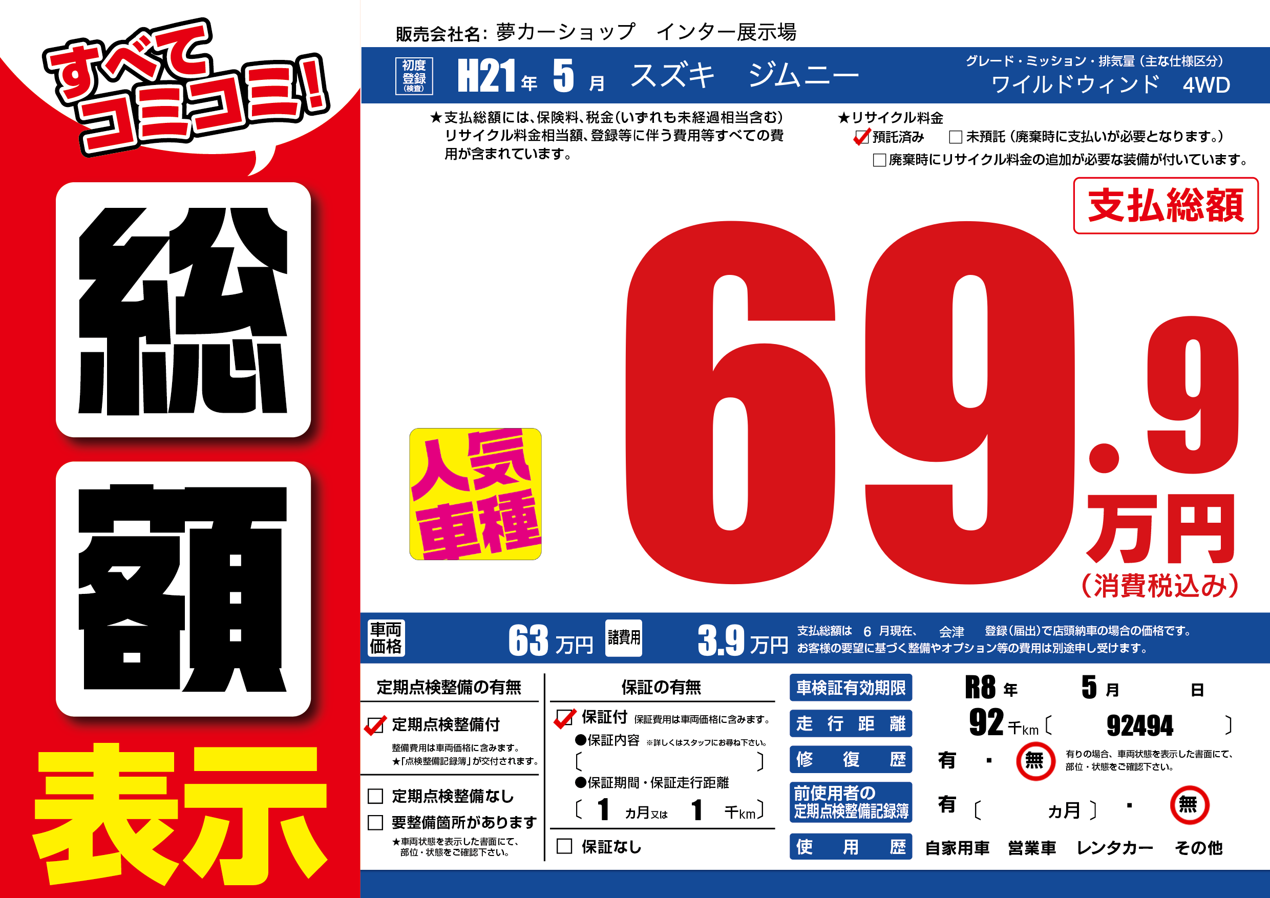 | 走行キロ | 9.2万km | 初年度登録 | H21年5月 |