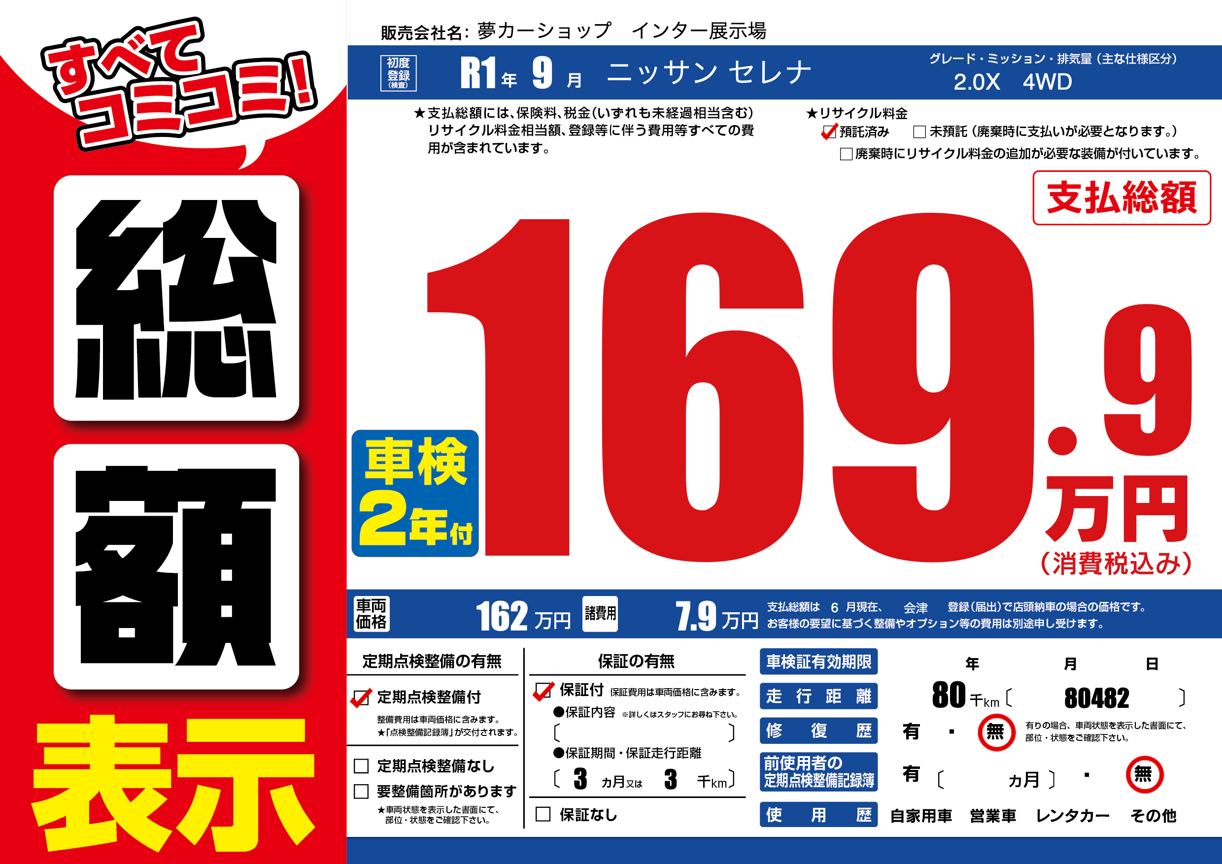 | 走行キロ | 8万km | 初年度登録 | R1年9月 |