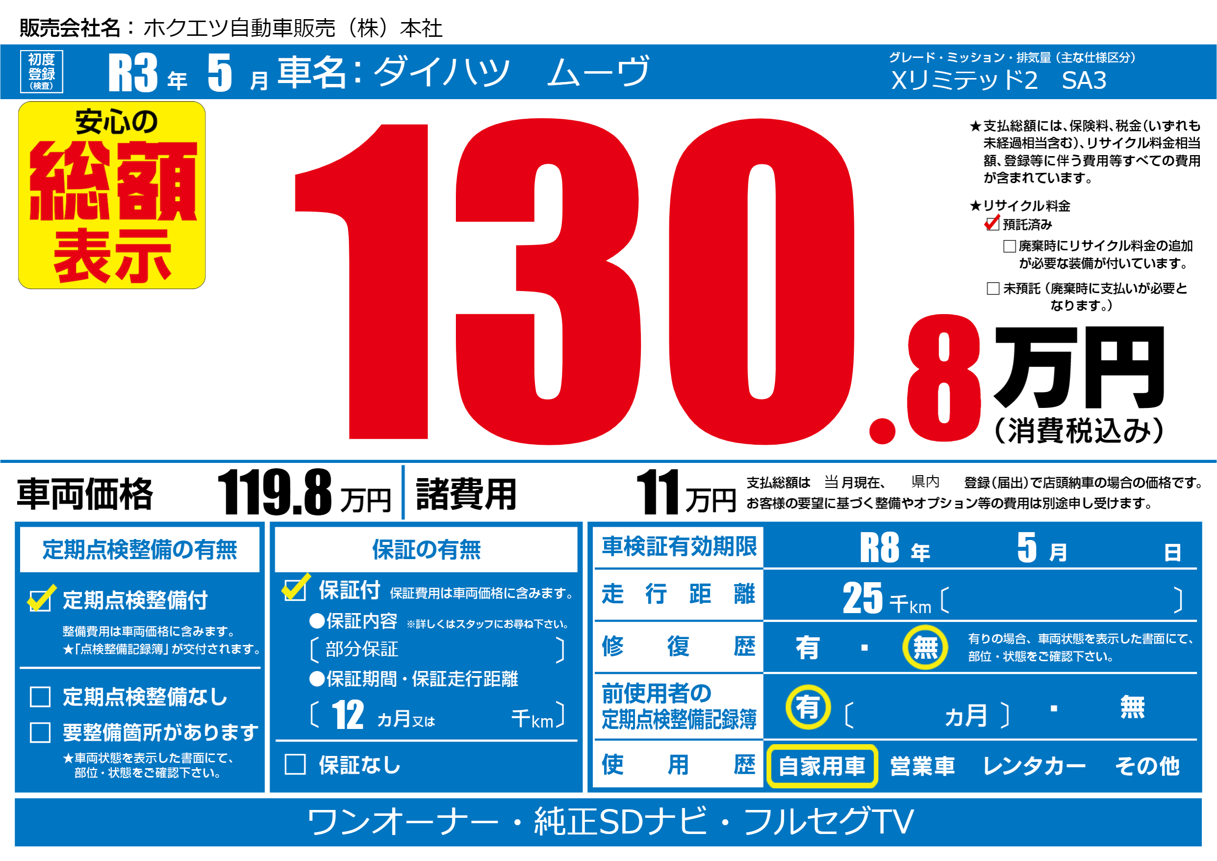 | 走行キロ | 2.5万km | 初年度登録 | R3年5月 |