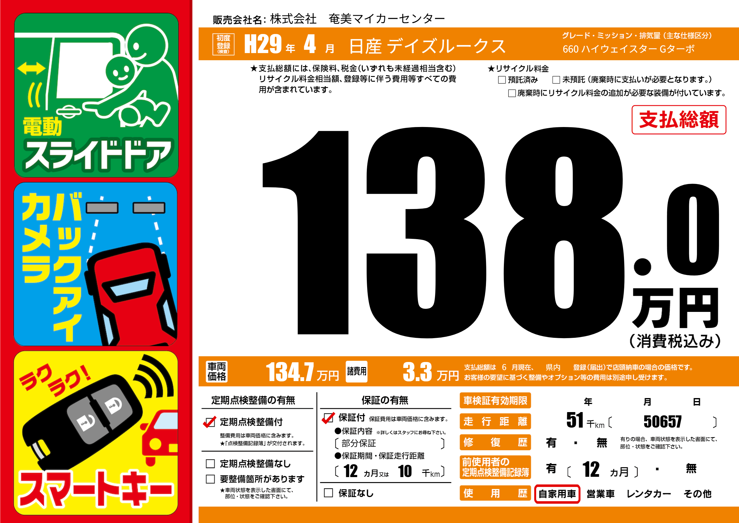 | 車名 | 日産 デイズルークス | グレード ミッション 排気量 |