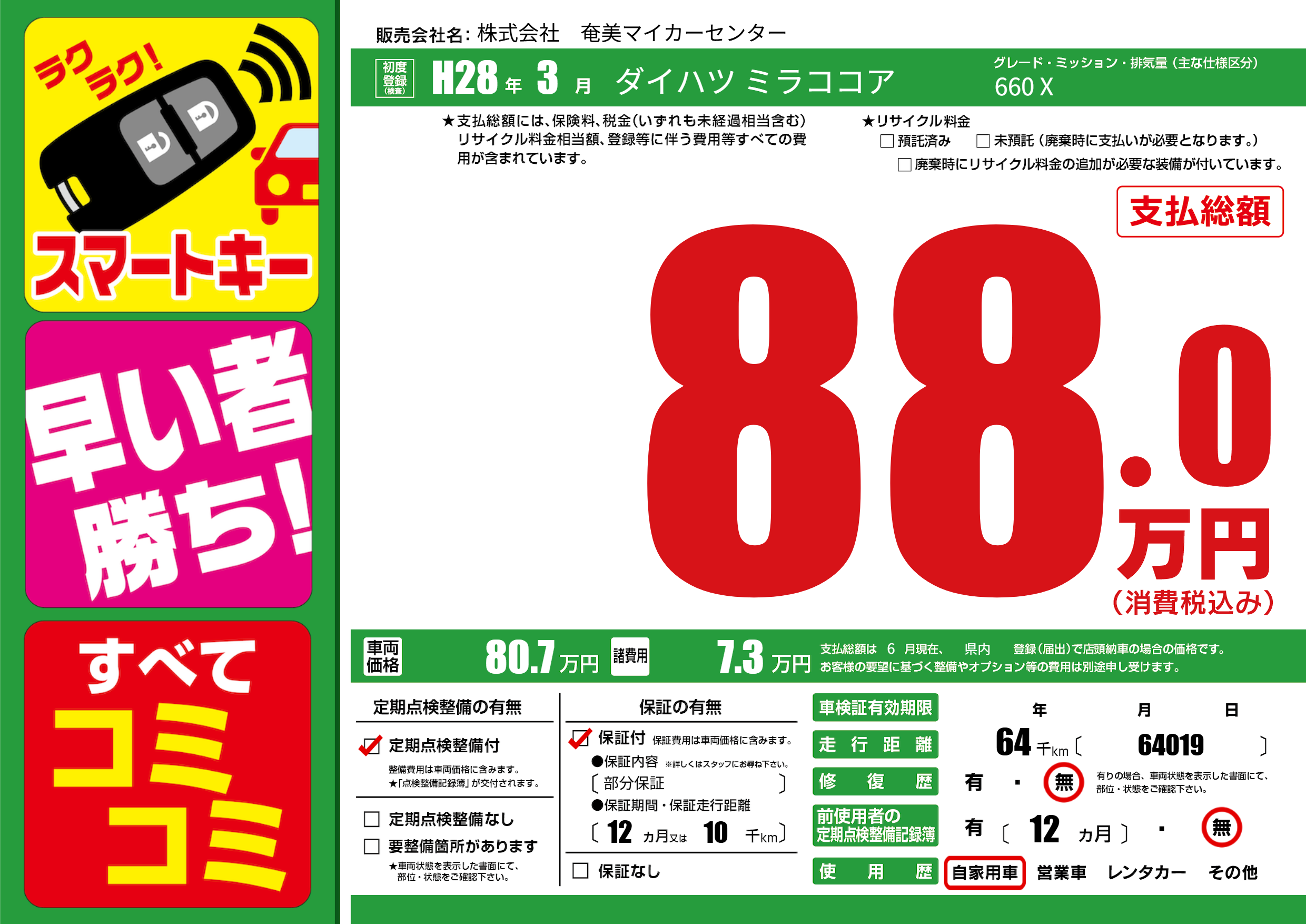 | 車名 | ダイハツ ミラココア | グレード ミッション 排気量 |