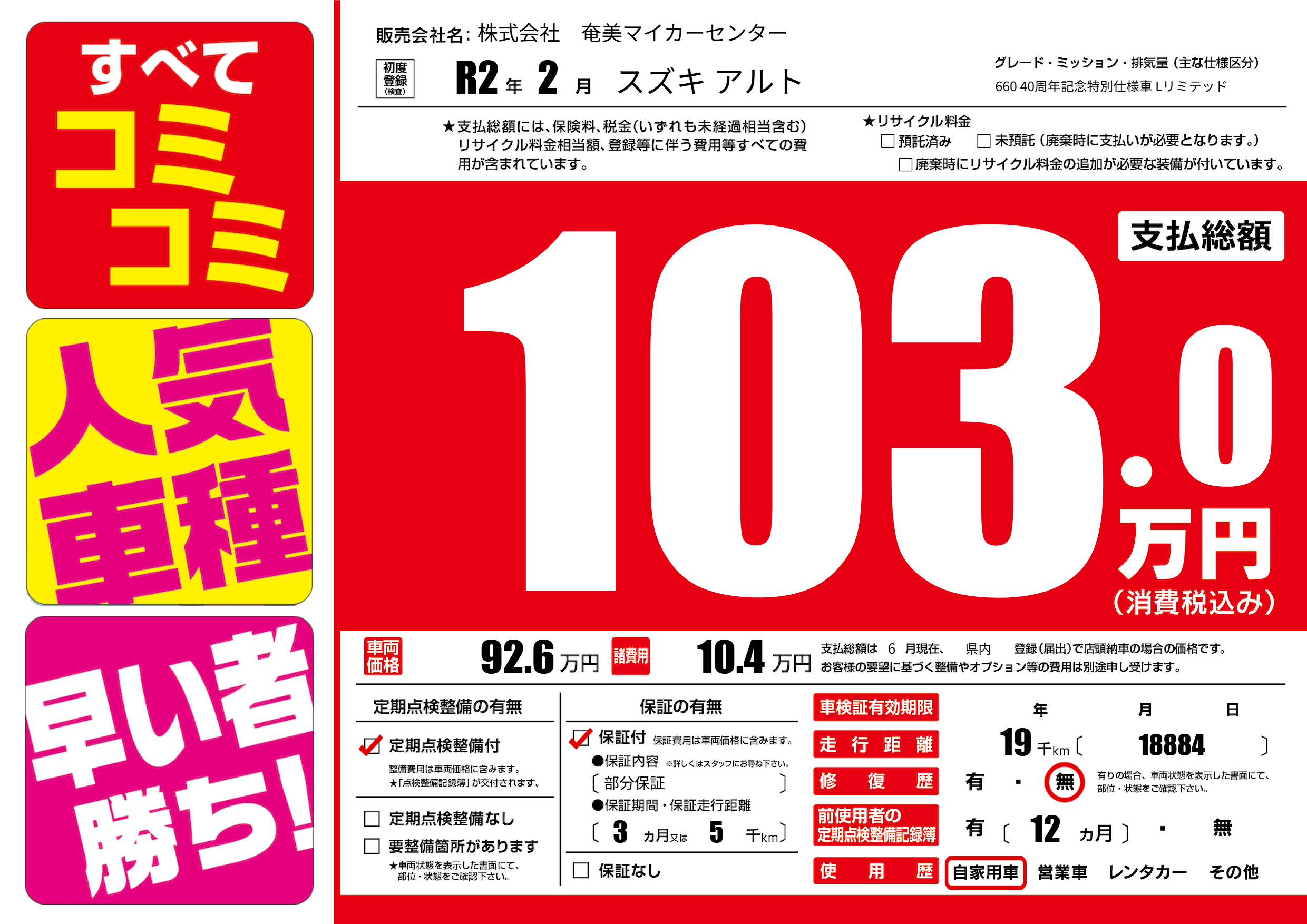保証付き 保証内容(部分保証) 3ヶ月または(5)千kmまで |