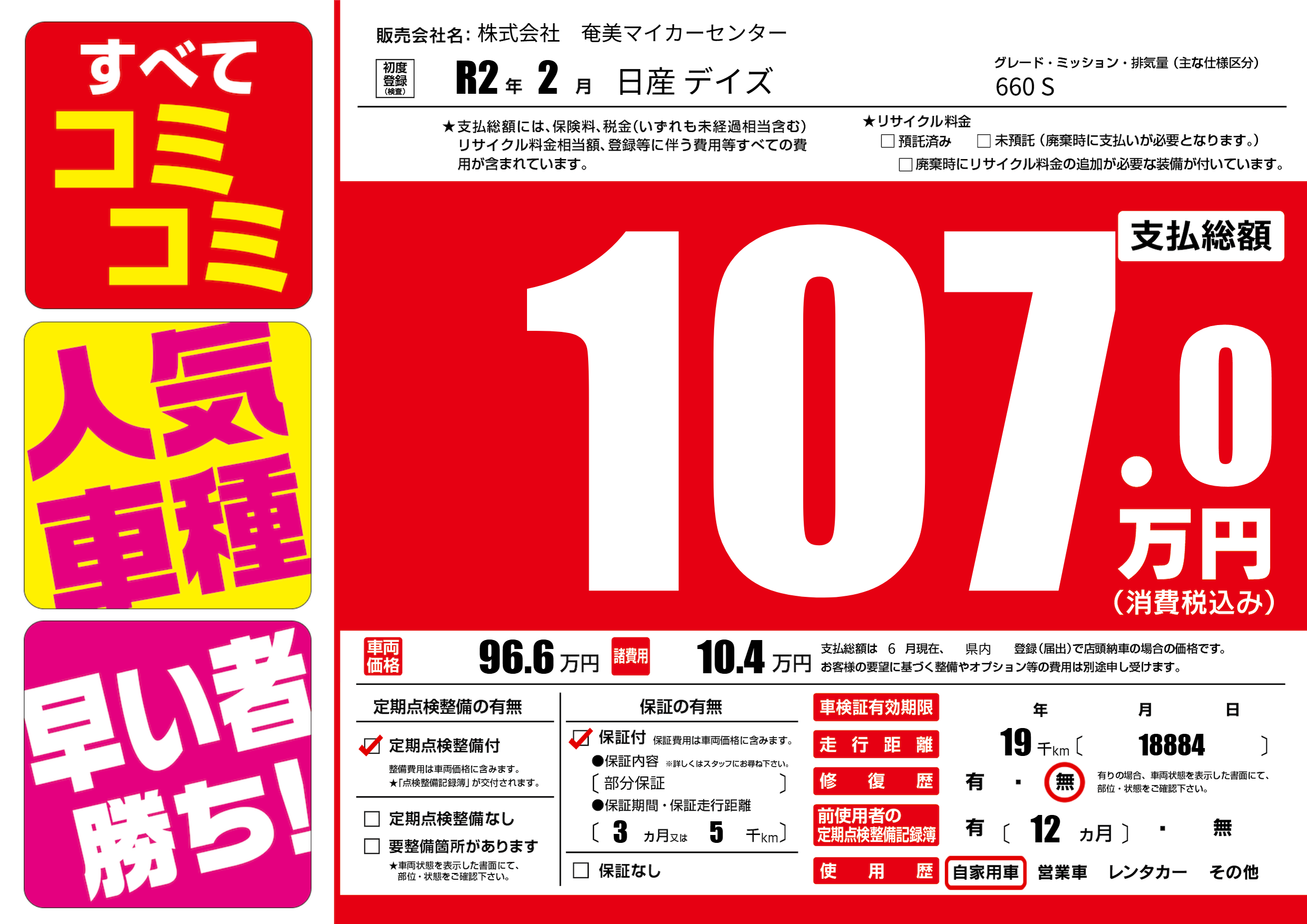 | 車名 | 日産 デイズ | グレード ミッション 排気量 |