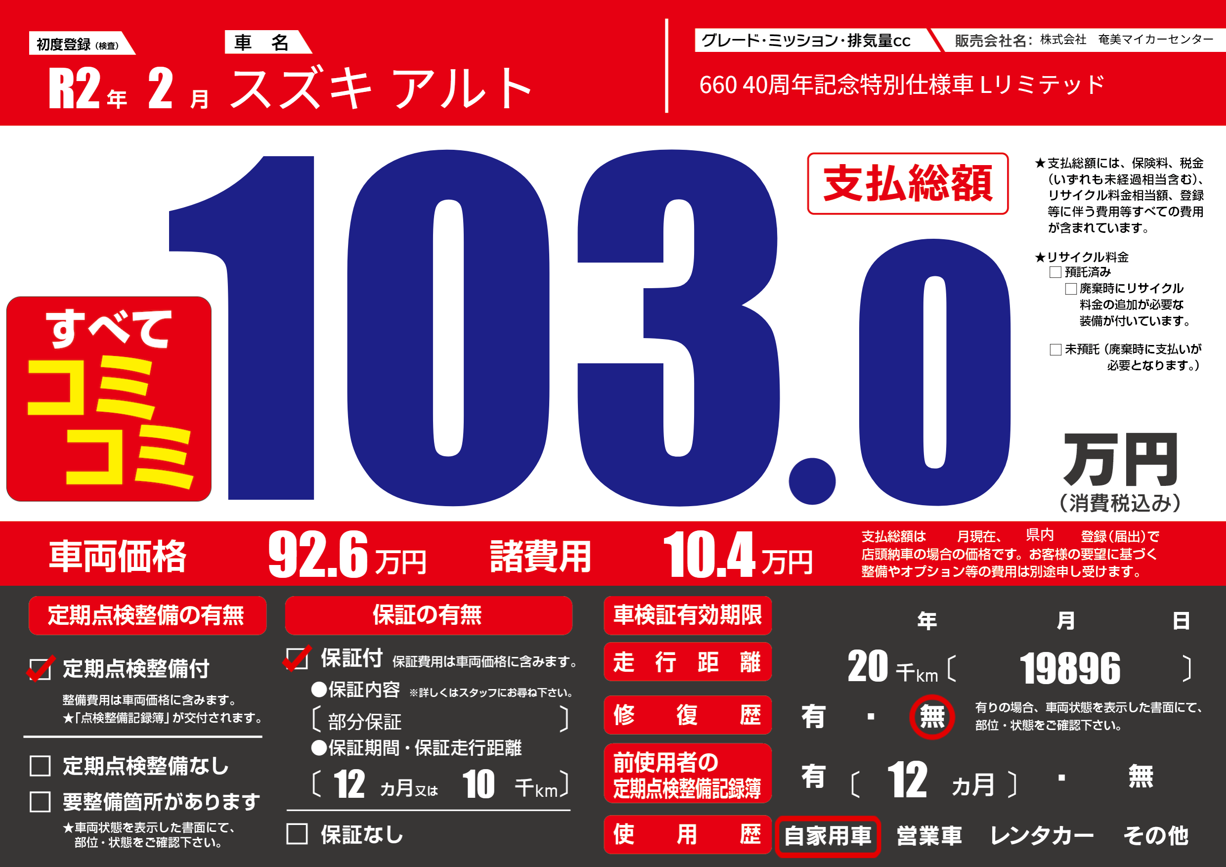 | 車名 | スズキ アルト | グレード ミッション 排気量 |