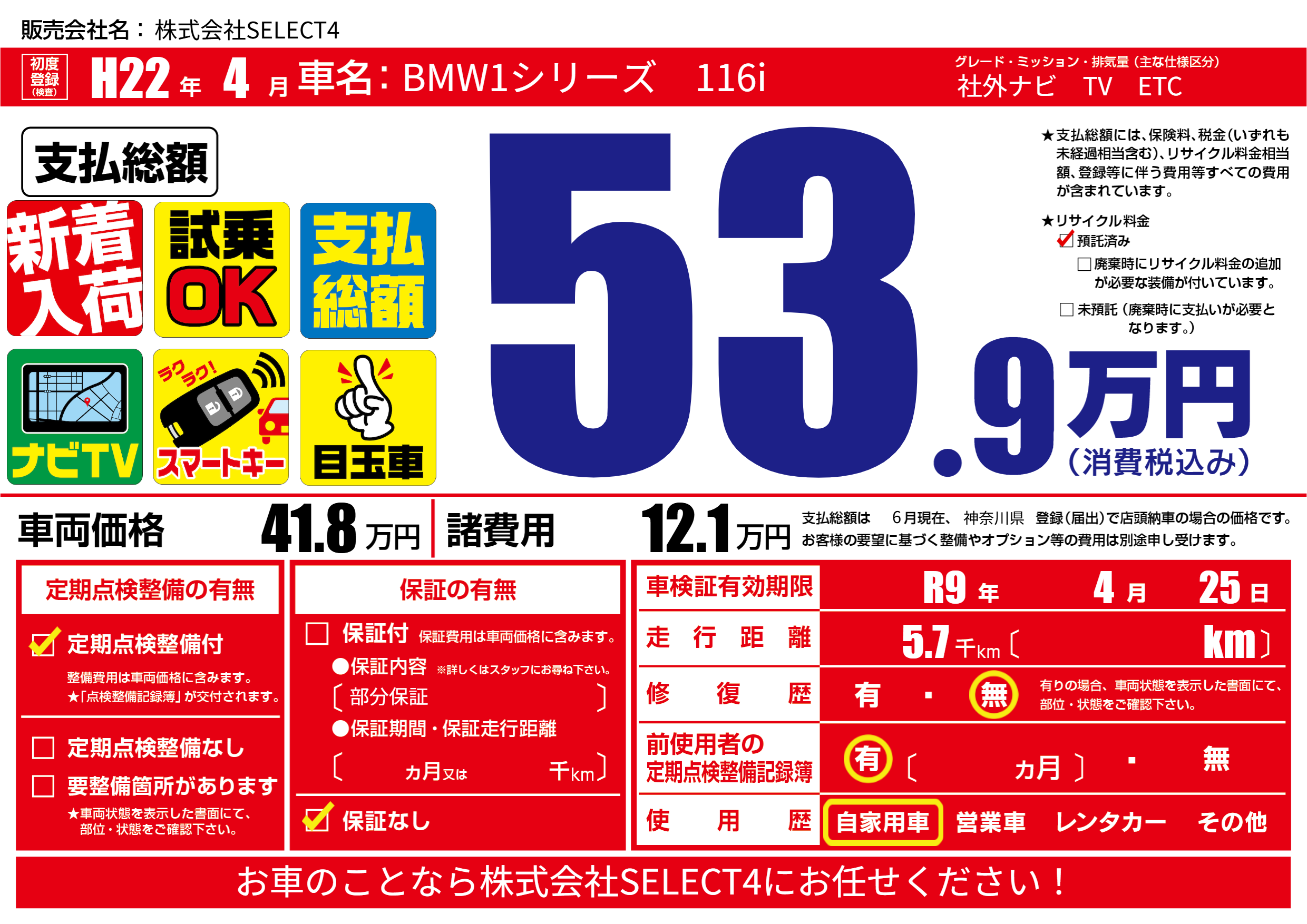 | 走行キロ | 0.5万km | 初年度登録 | H22年4月 |