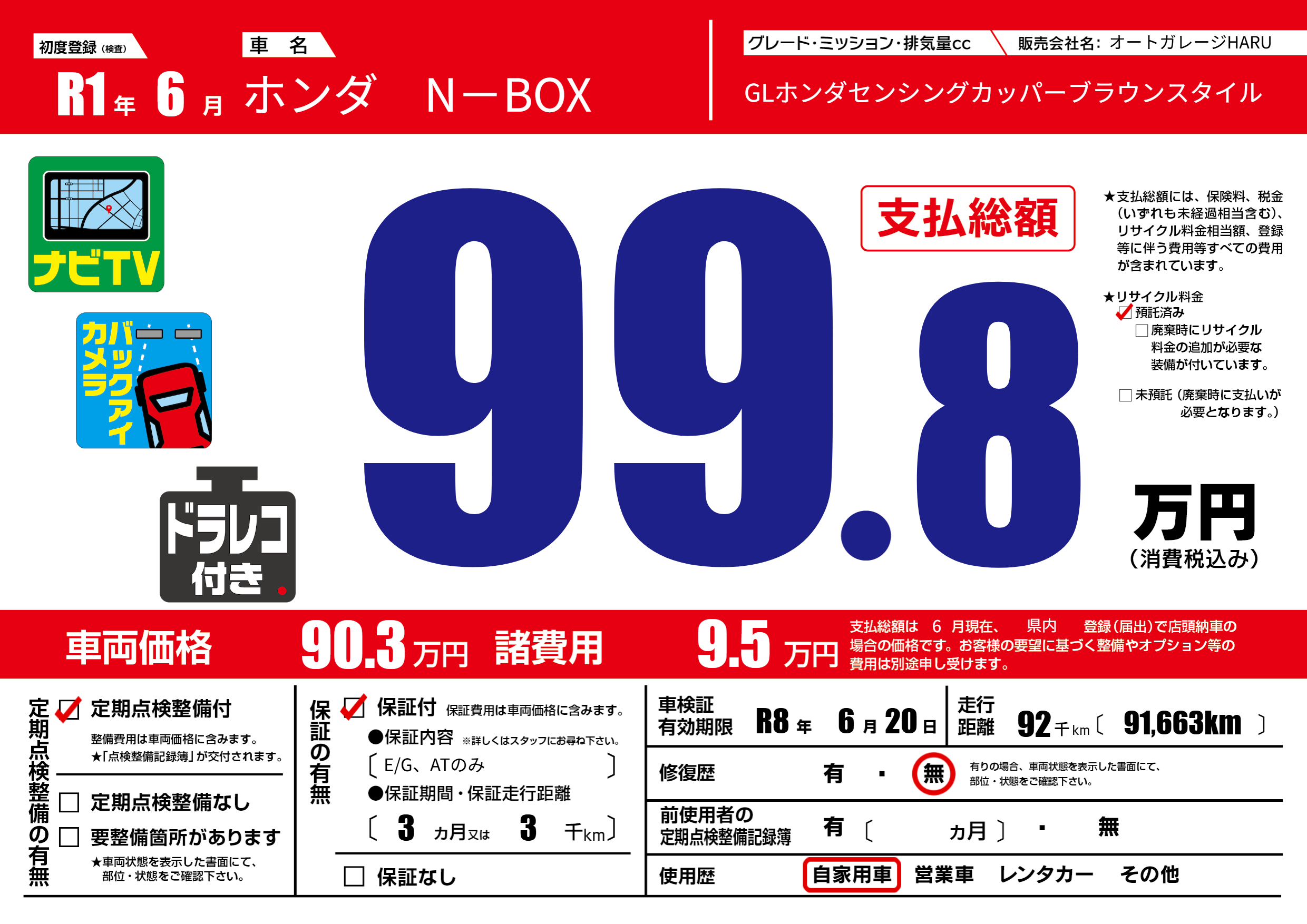 | 車名 | ホンダ N-BOX | グレード ミッション 排気量 |