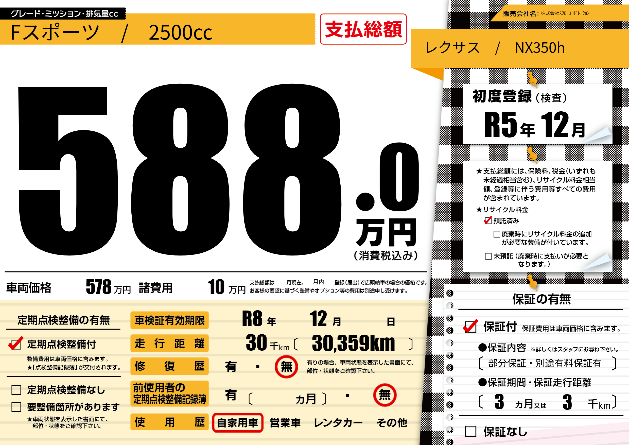 | 走行キロ | 3万km | 初年度登録 | R5年12月 |