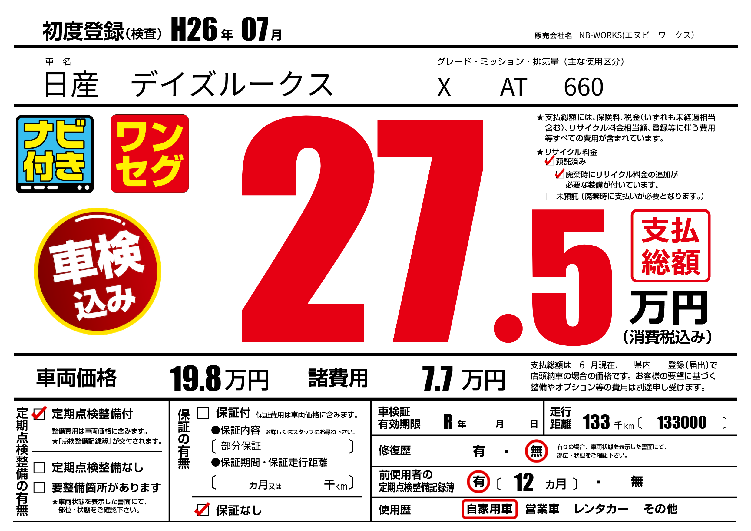 | 走行キロ | 13.3万km | 初年度登録 | H26年07月 |