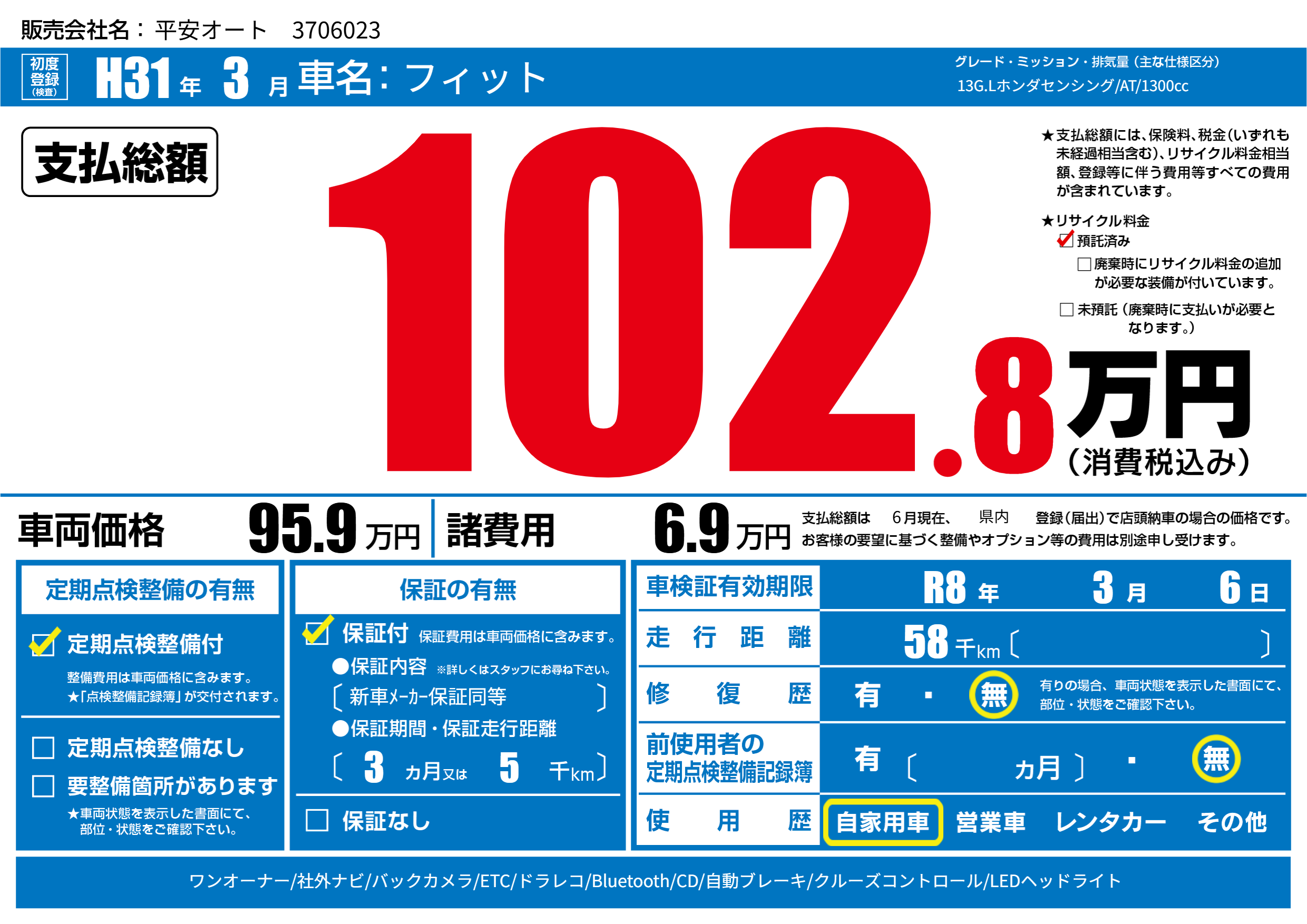 | 走行キロ | 5.8万km | 初年度登録 | H31年3月 |
