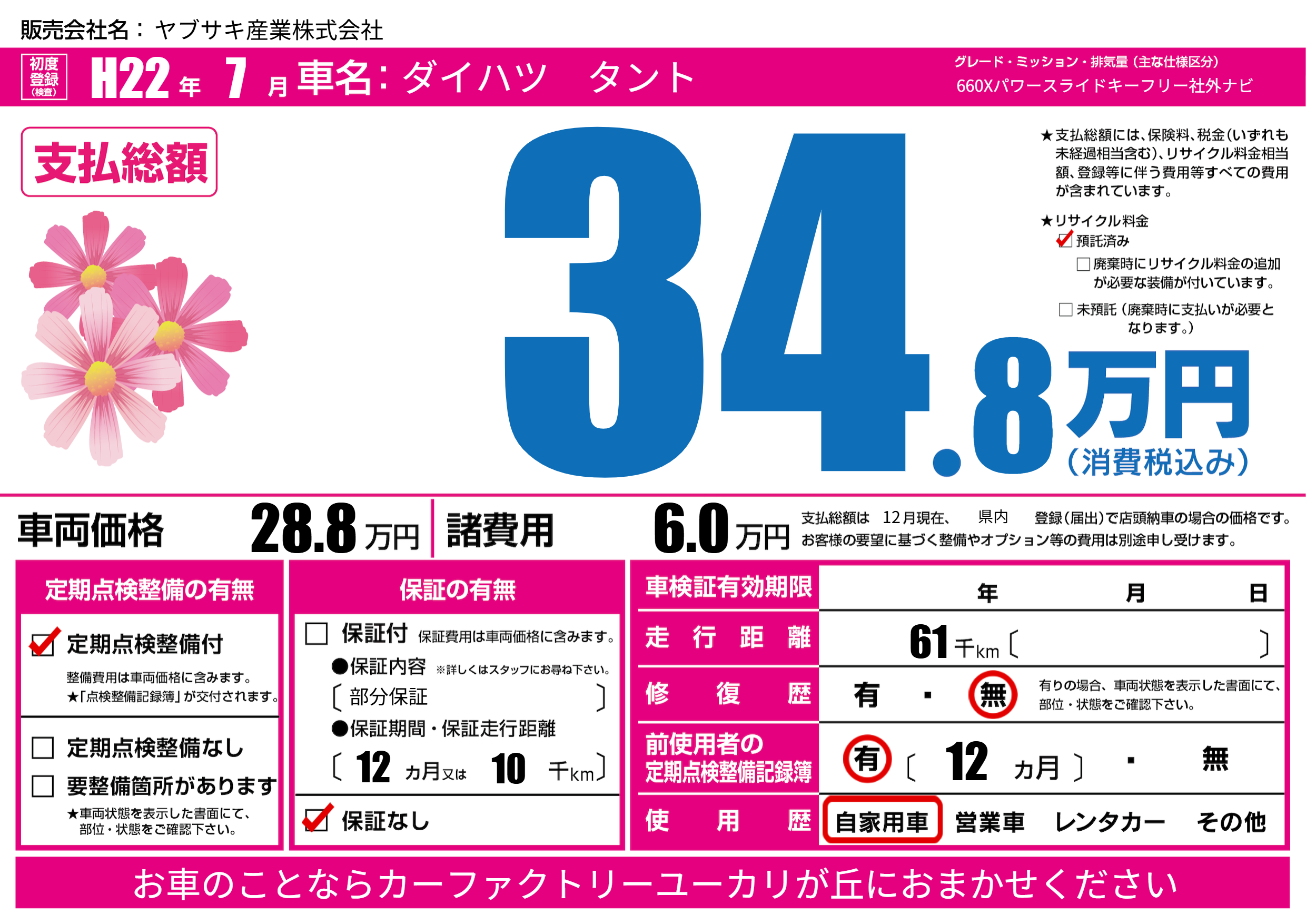 | 走行キロ | 6.1万km | 初年度登録 | H22年7月 |