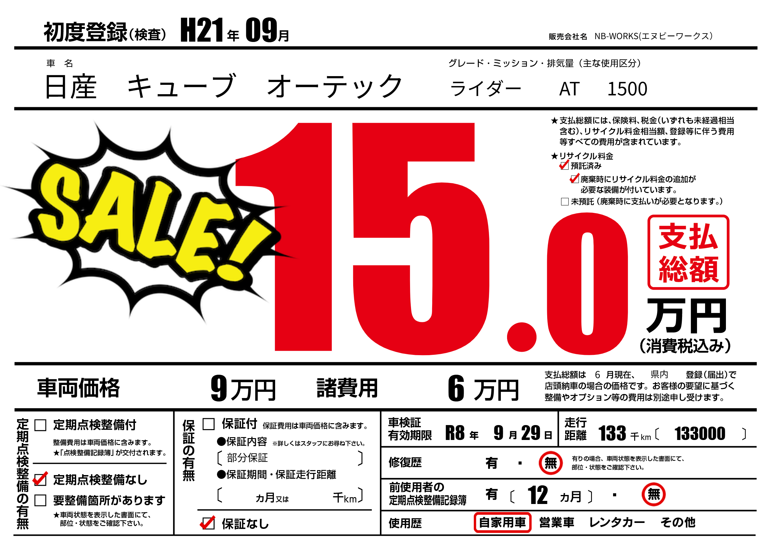 | 走行キロ | 13.3万km | 初年度登録 | H21年09月 |