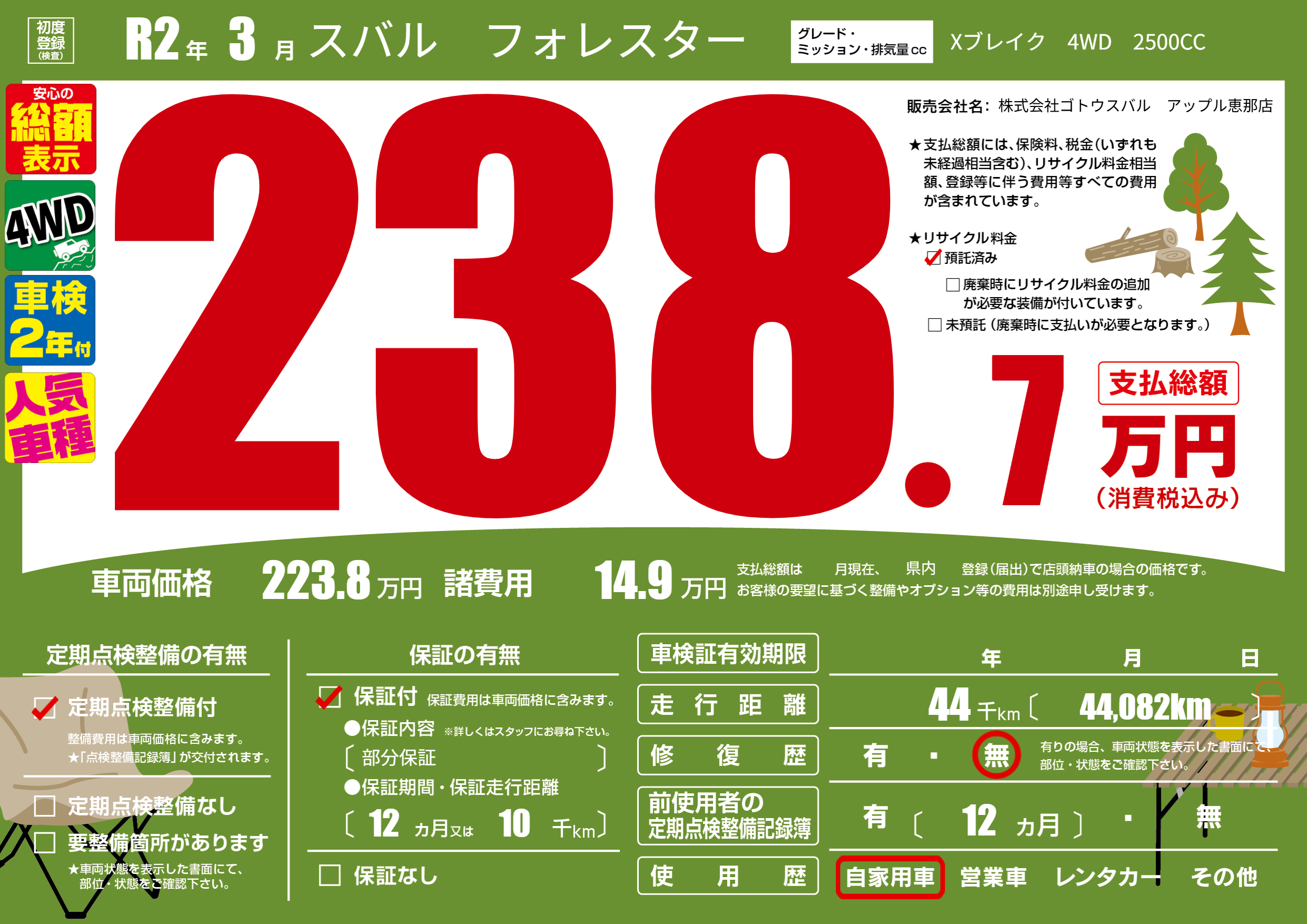 | 車名 | スバル フォレスター | グレード ミッション 排気量 |