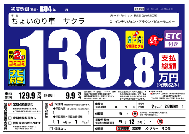 | 走行キロ | 0.6万km | 初年度登録 | R05年05月 |