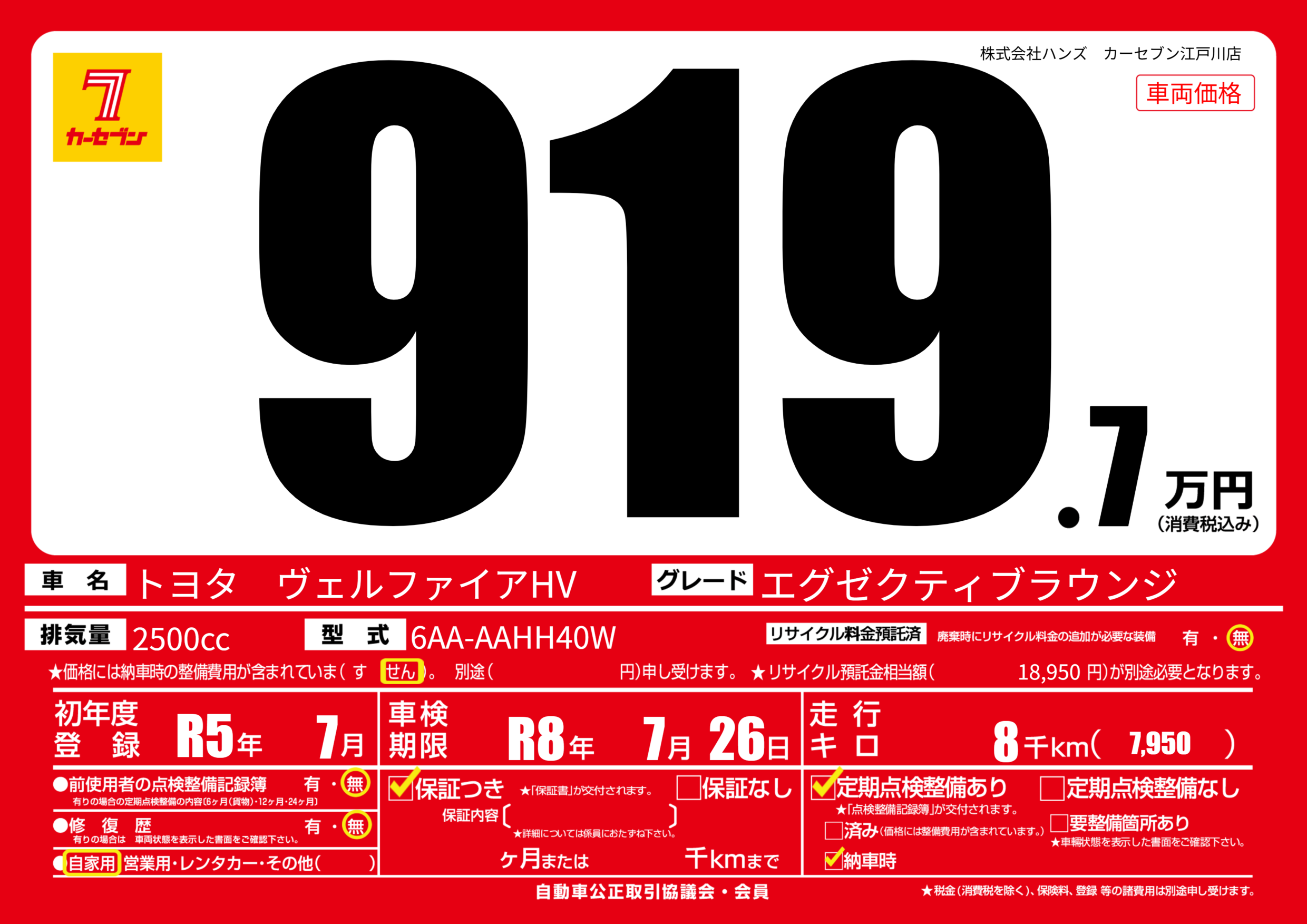 | 車名 | トヨタ ヴェルファイアHV | グレード ミッション 排気量 |