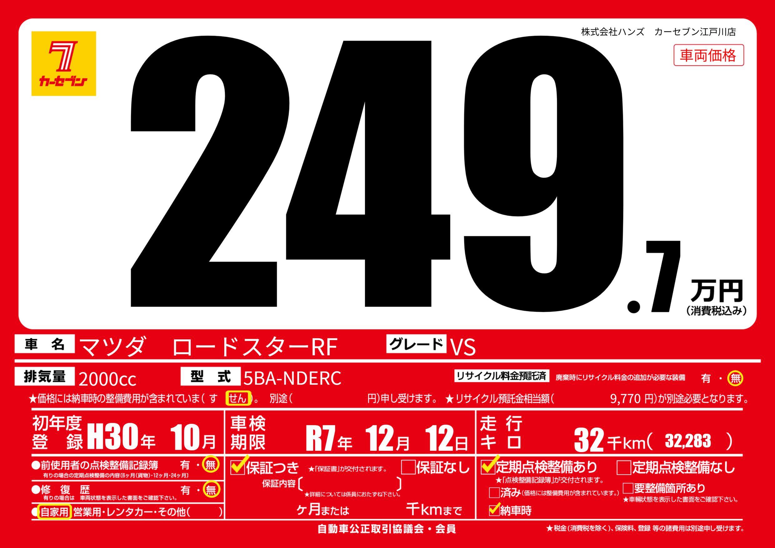 | 車名 | マツダ ロードスターRF | グレード ミッション 排気量 |
