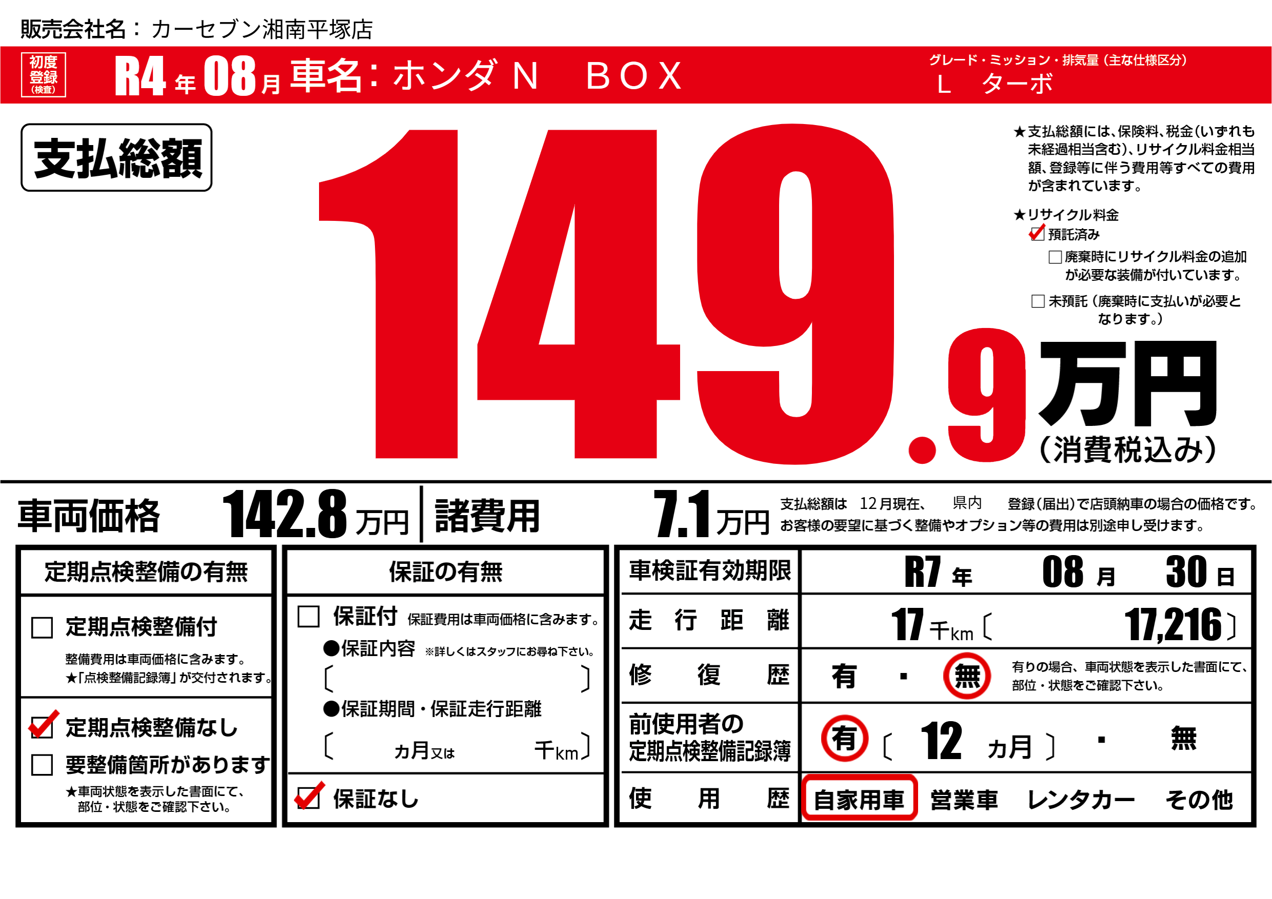 | 走行キロ | 1.7万km | 初年度登録 | R4年08月 |