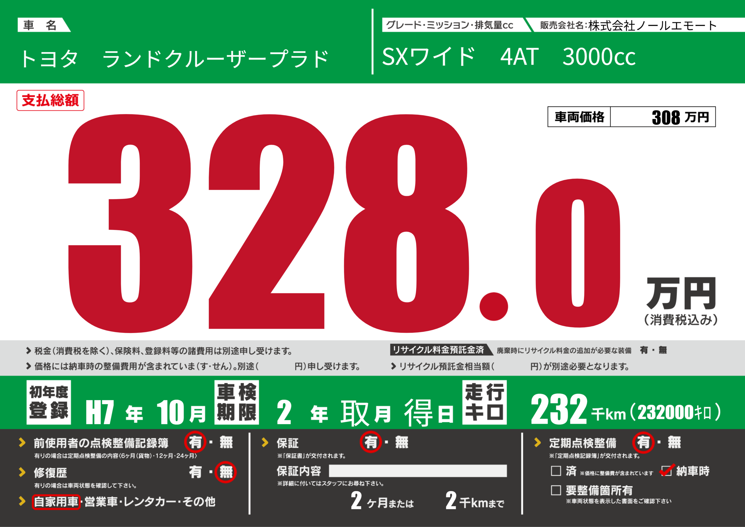 | 走行キロ | 23.2万km | 初年度登録 | H7年10月 |