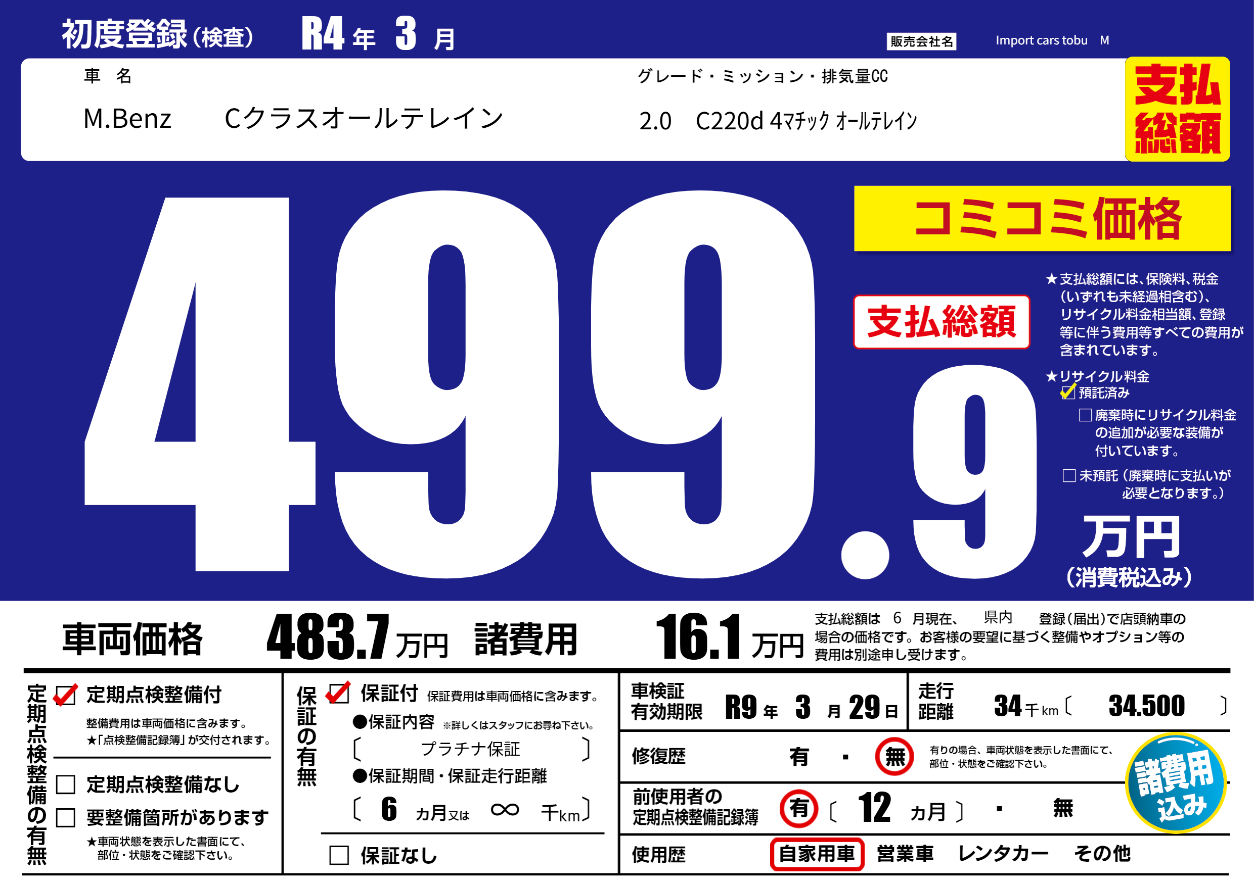 | 車名 | M.Benz Cクラスオールテレイン | グレード ミッション 排気量 |