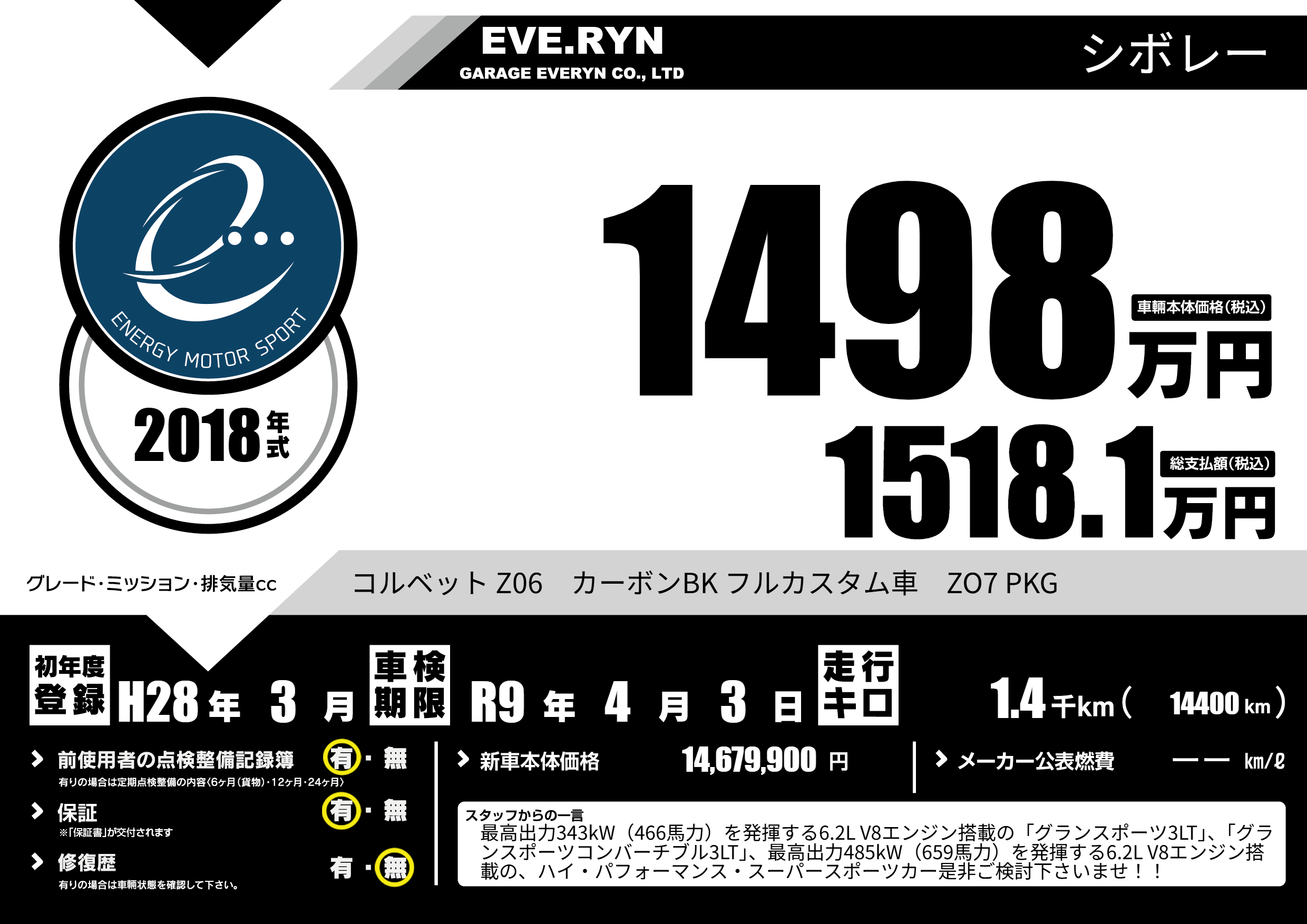 コルベット Z06 カーボンBK フルカスタム車 ZO7 PKG |