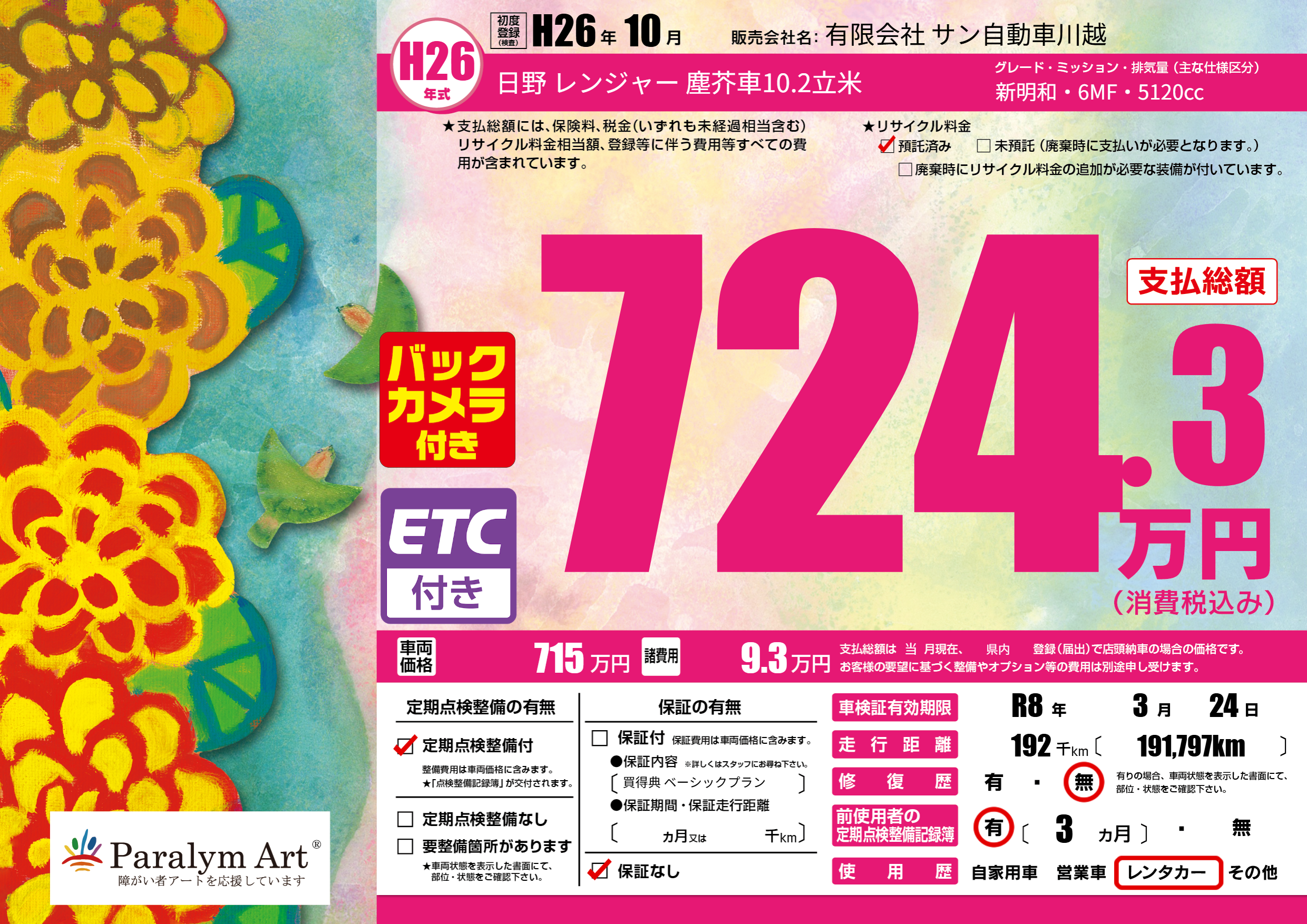 | 走行キロ | 19.2万km | 初年度登録 | H26年10月 |