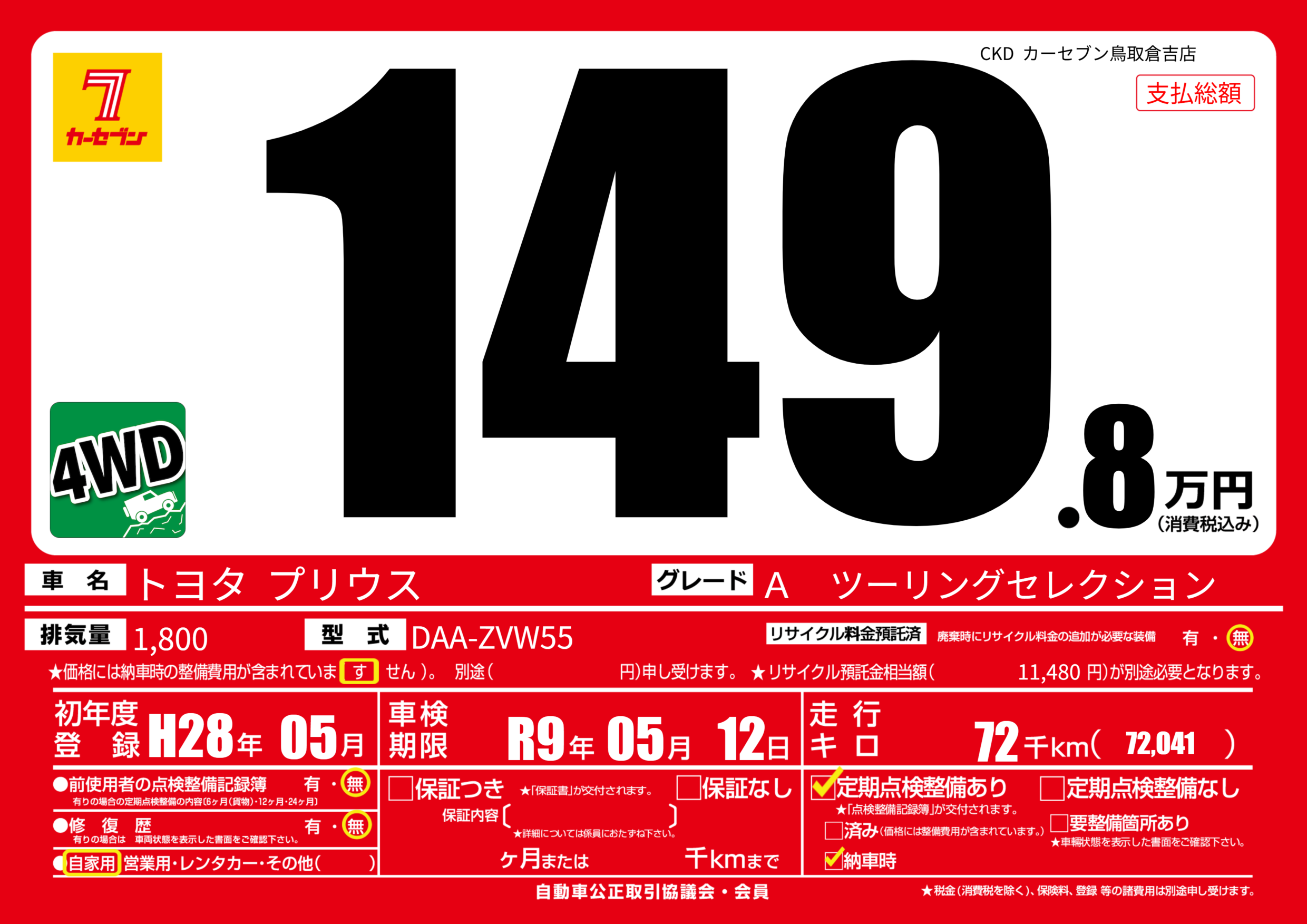 | 車名 | トヨタ プリウス | グレード ミッション 排気量 |