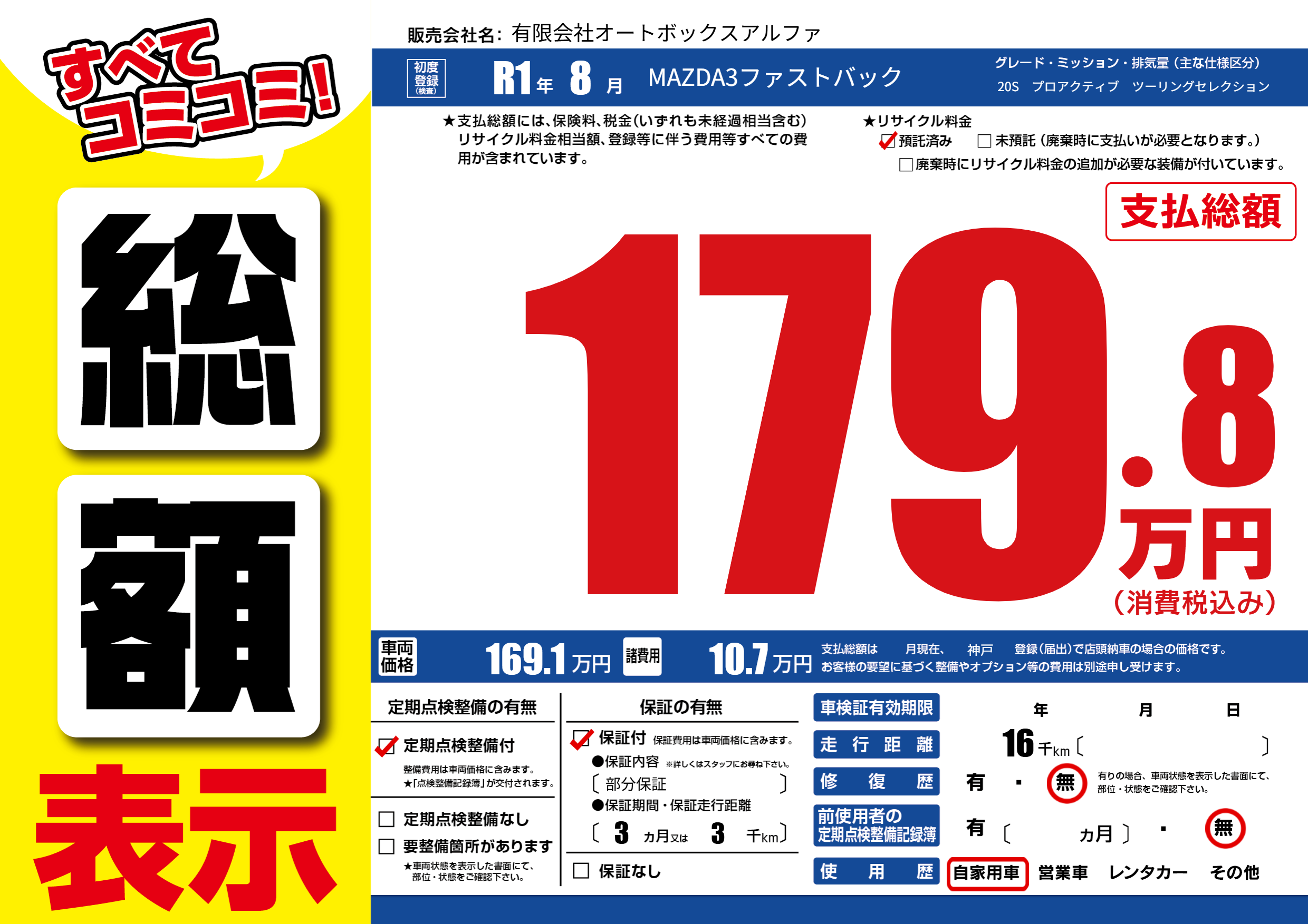 | 車名 | MAZDA3ファストバック | グレード ミッション 排気量 |