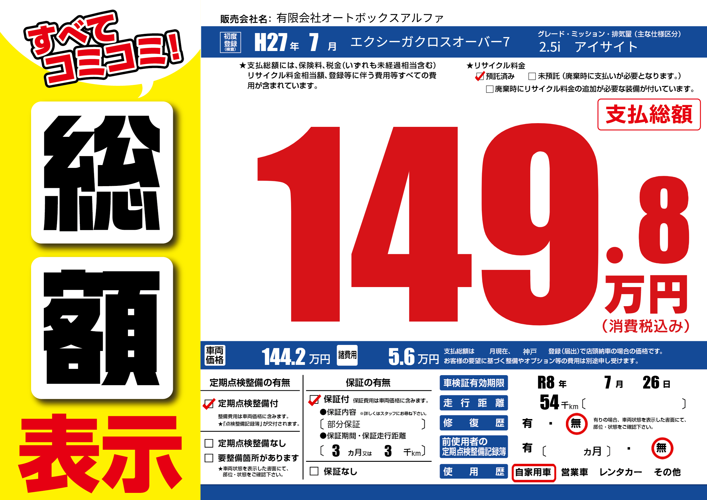| 車検制限 | R8年 7月 26日 | ||
