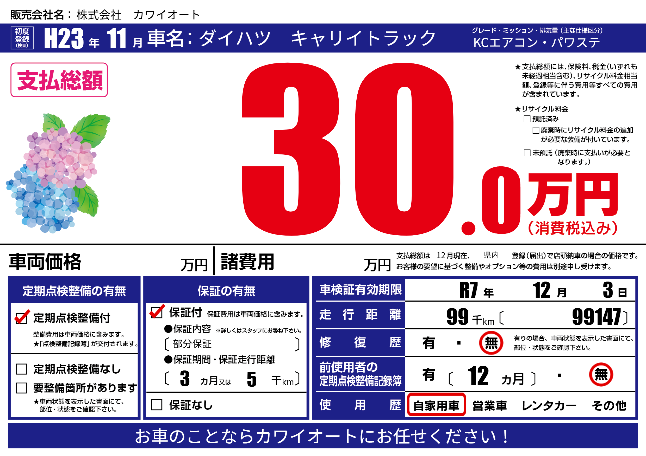 | 走行キロ | 9.9万km | 初年度登録 | H23年11月 |