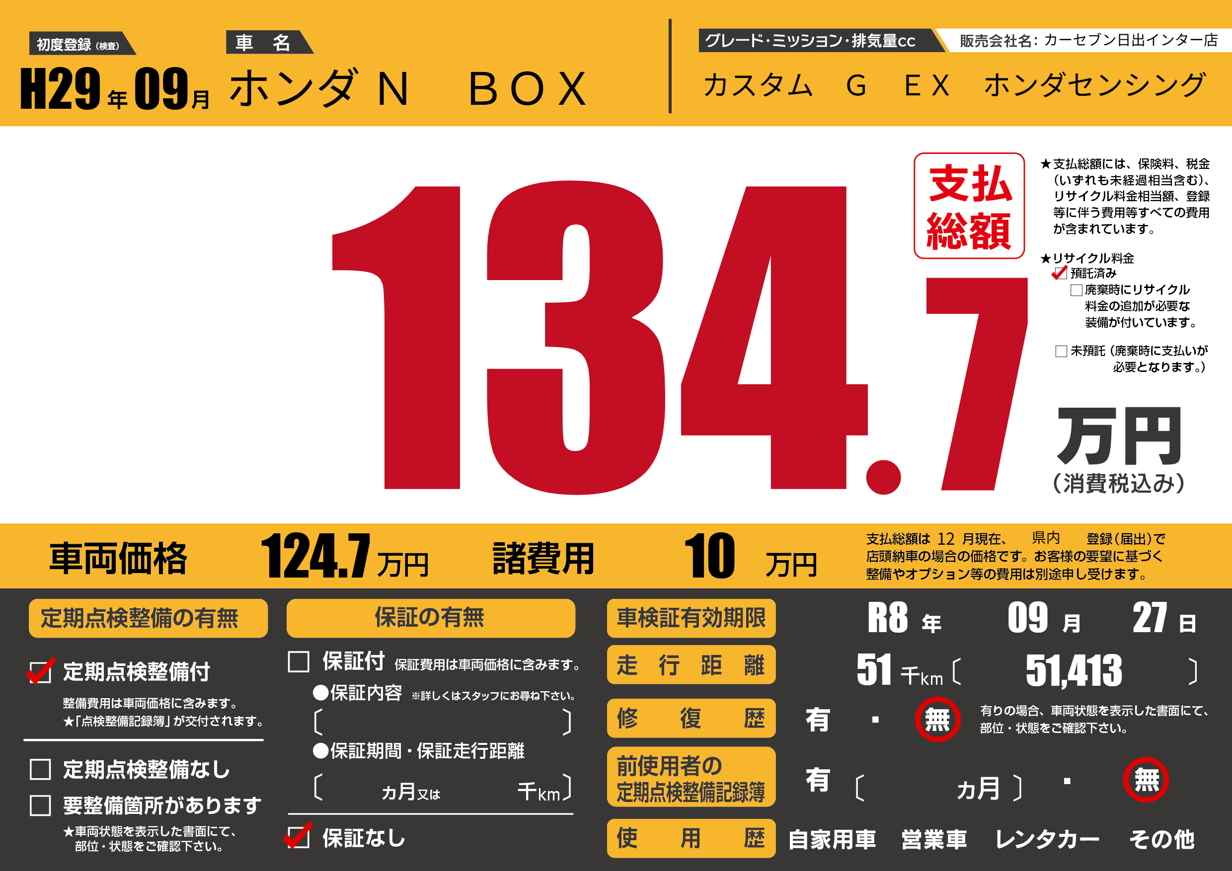 | 車名 | ホンダ N BOX | グレード ミッション 排気量 |