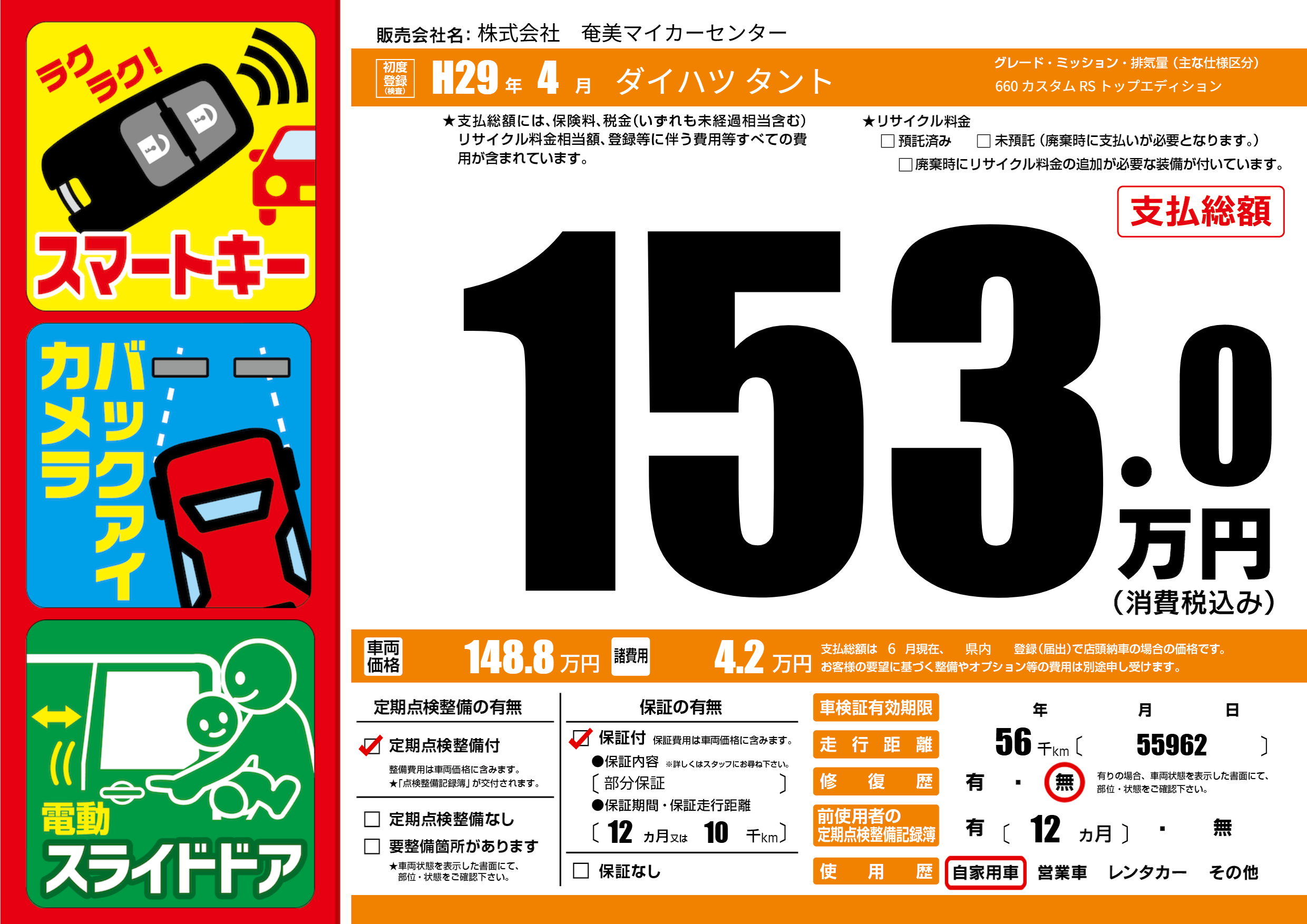 | 車名 | ダイハツ タント | グレード ミッション 排気量 |