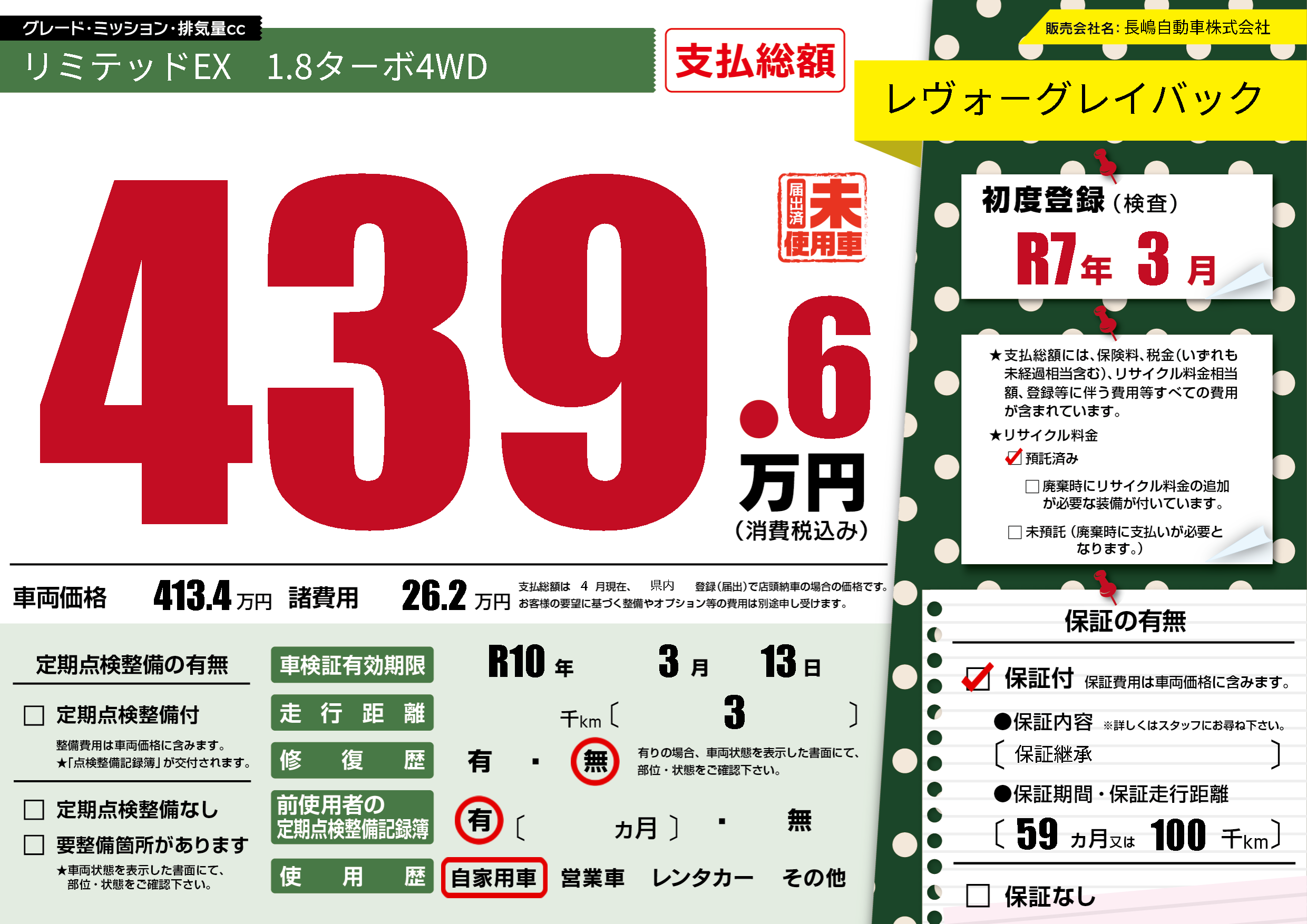 保証付き 保証内容(保証継承) 59ヶ月または(100)千kmまで |