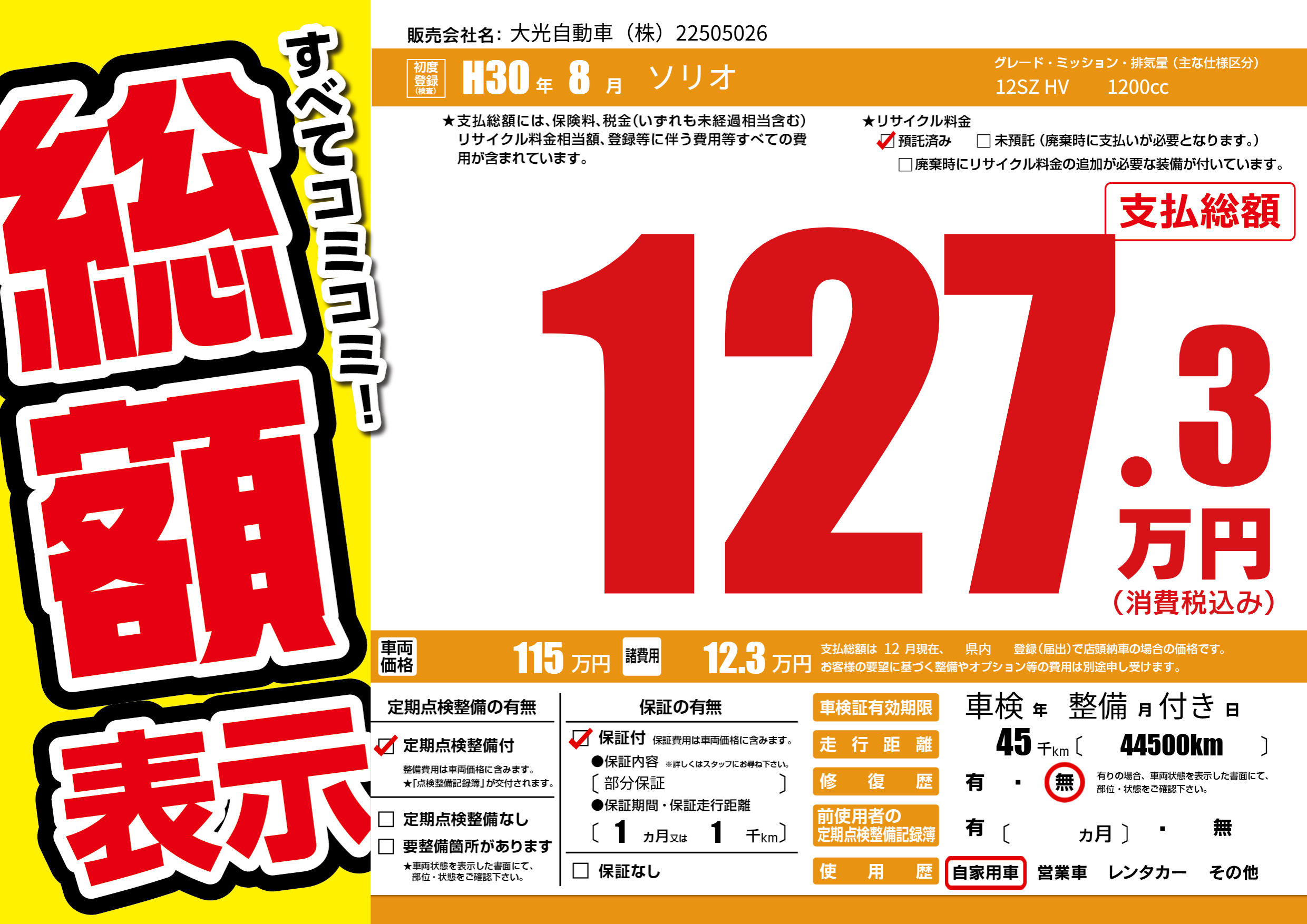 | 車名 | ソリオ | グレード ミッション 排気量 |