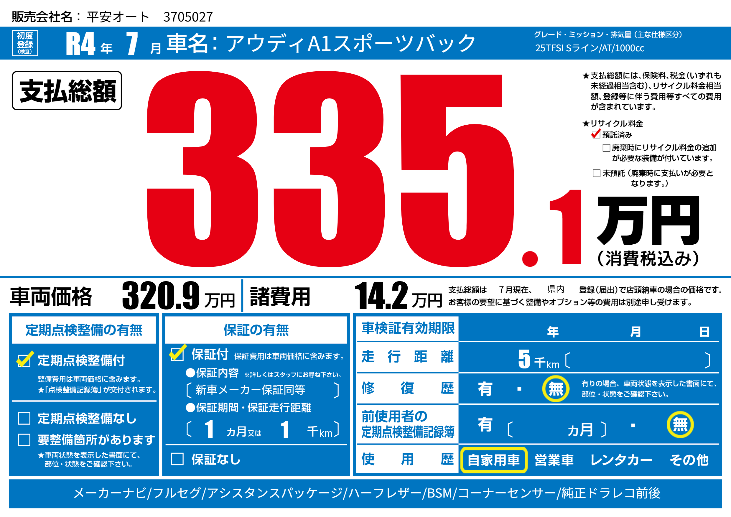 | 車名 | アウディA1スポーツバック | グレード ミッション 排気量 |