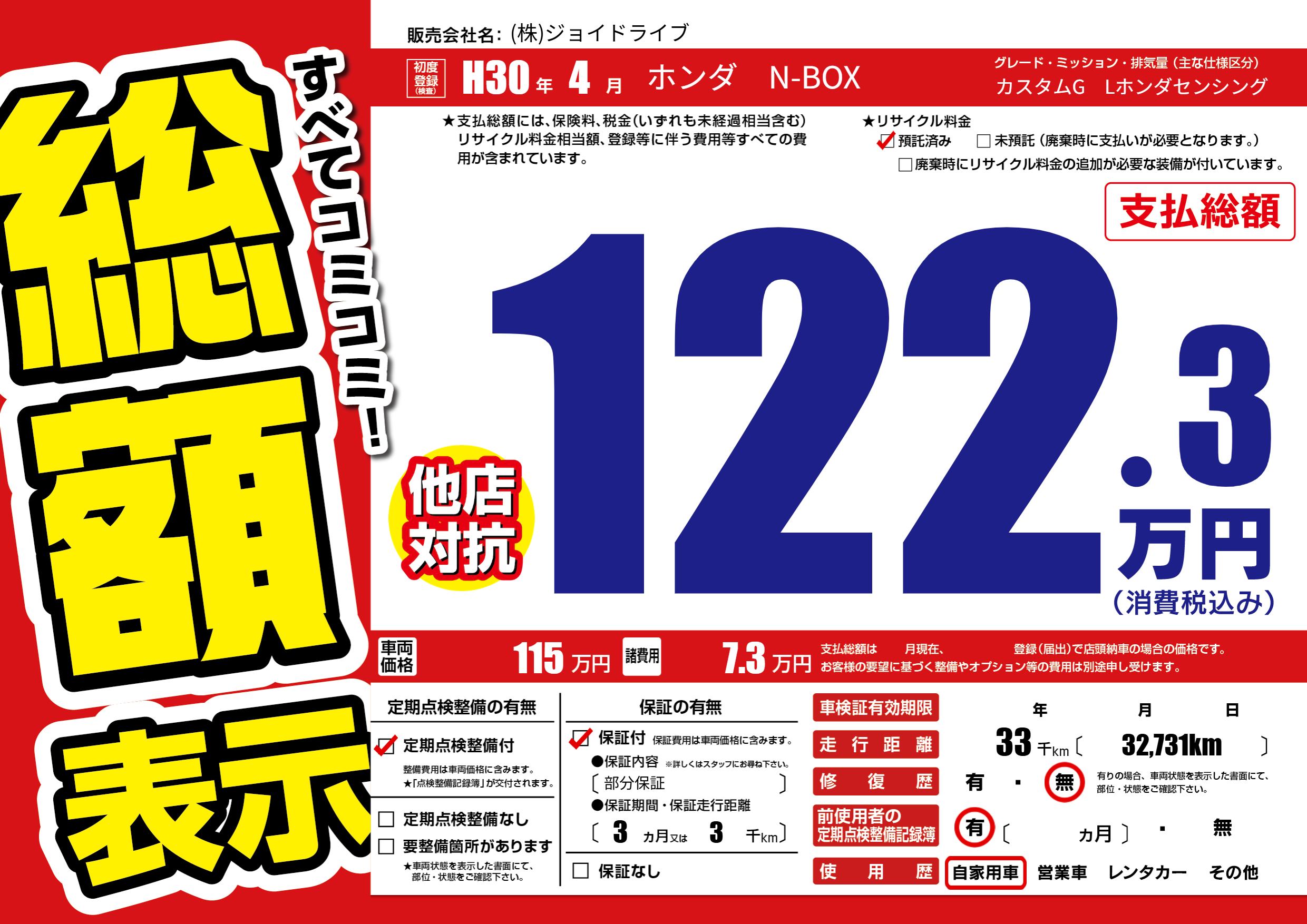 | 車名 | ホンダ N-BOX | グレード ミッション 排気量 |