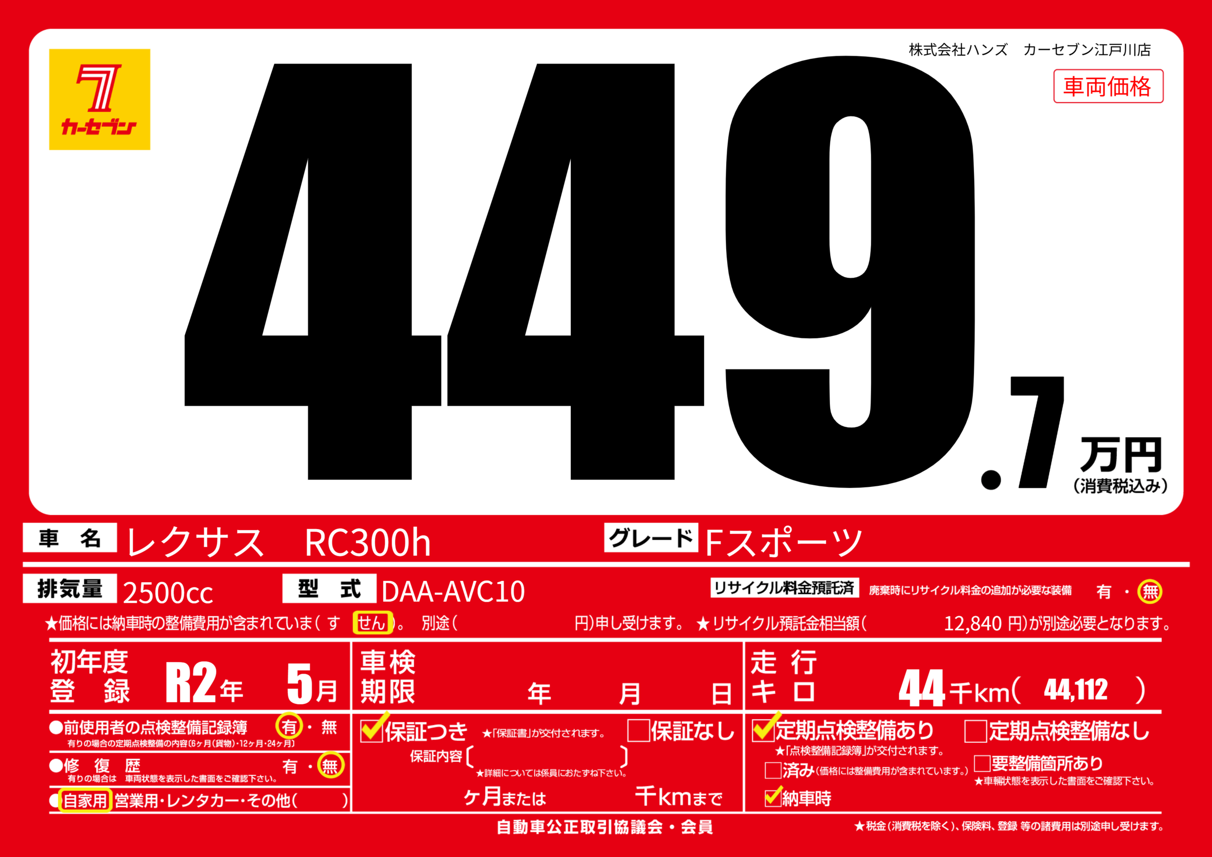 | 車名 | レクサス RC300h | グレード ミッション 排気量 |