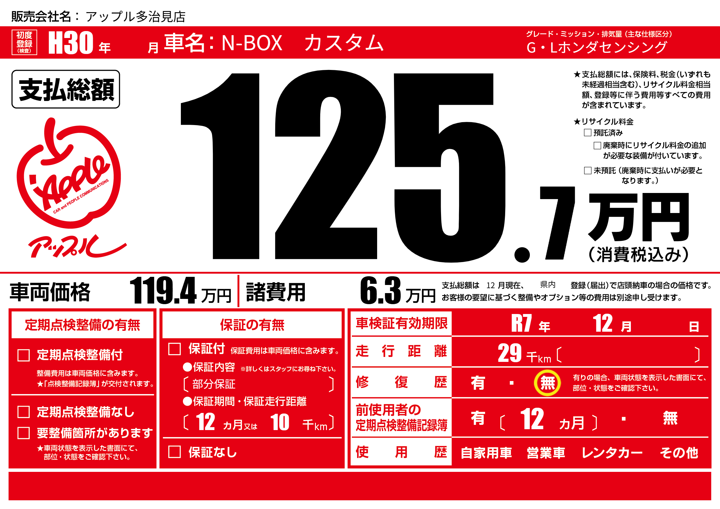 | 車検制限 | R7年 12月 - 日 | ||