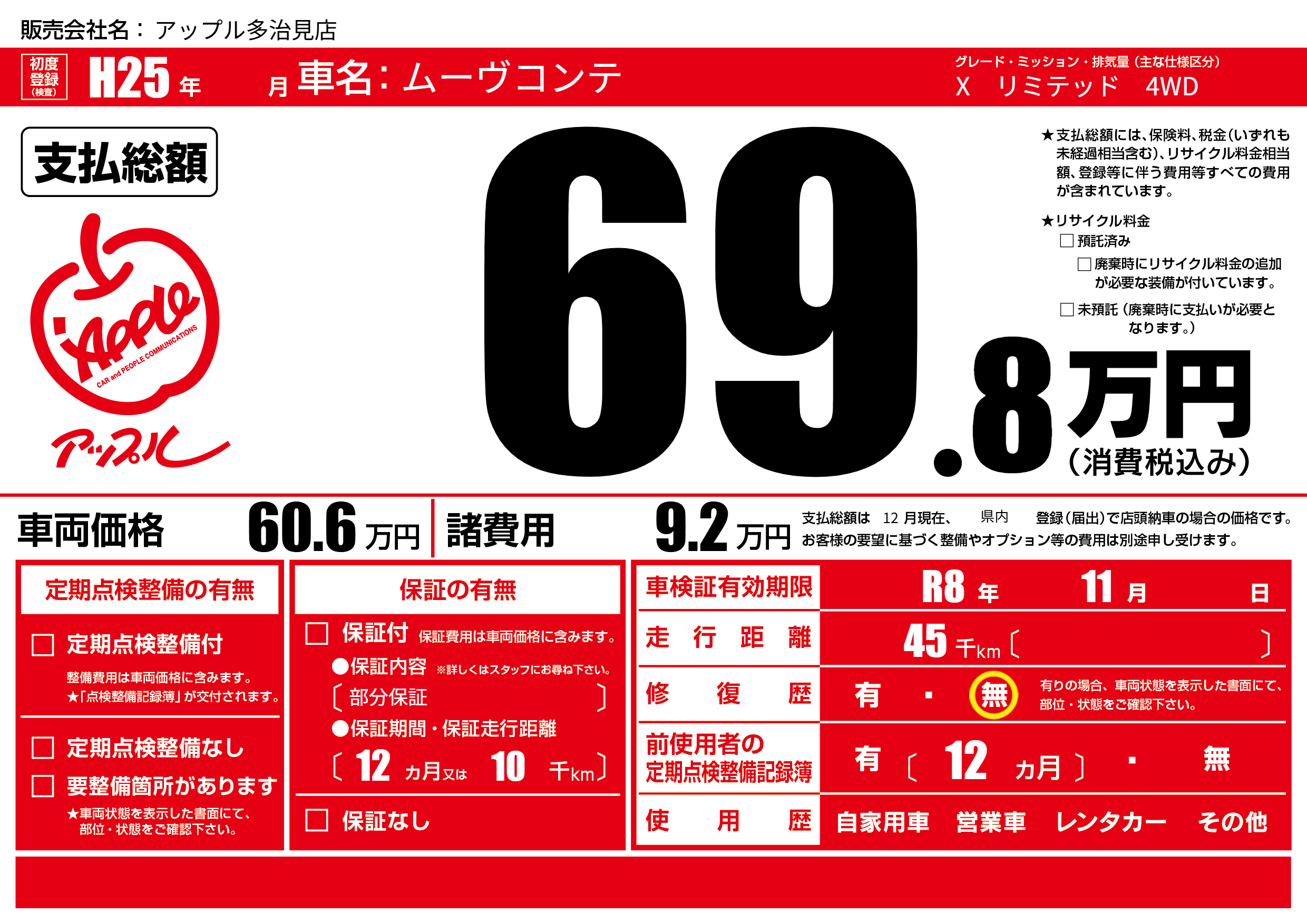 | 車名 | ムーヴコンテ | グレード ミッション 排気量 |
