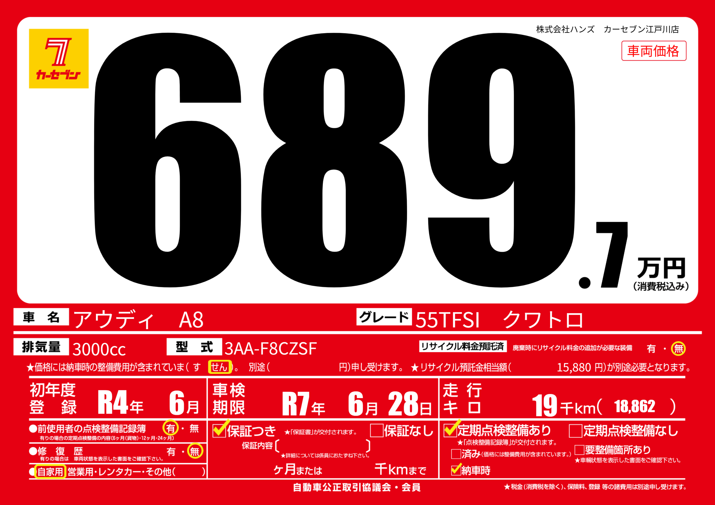 | 車名 | アウディ A8 | グレード ミッション 排気量 |