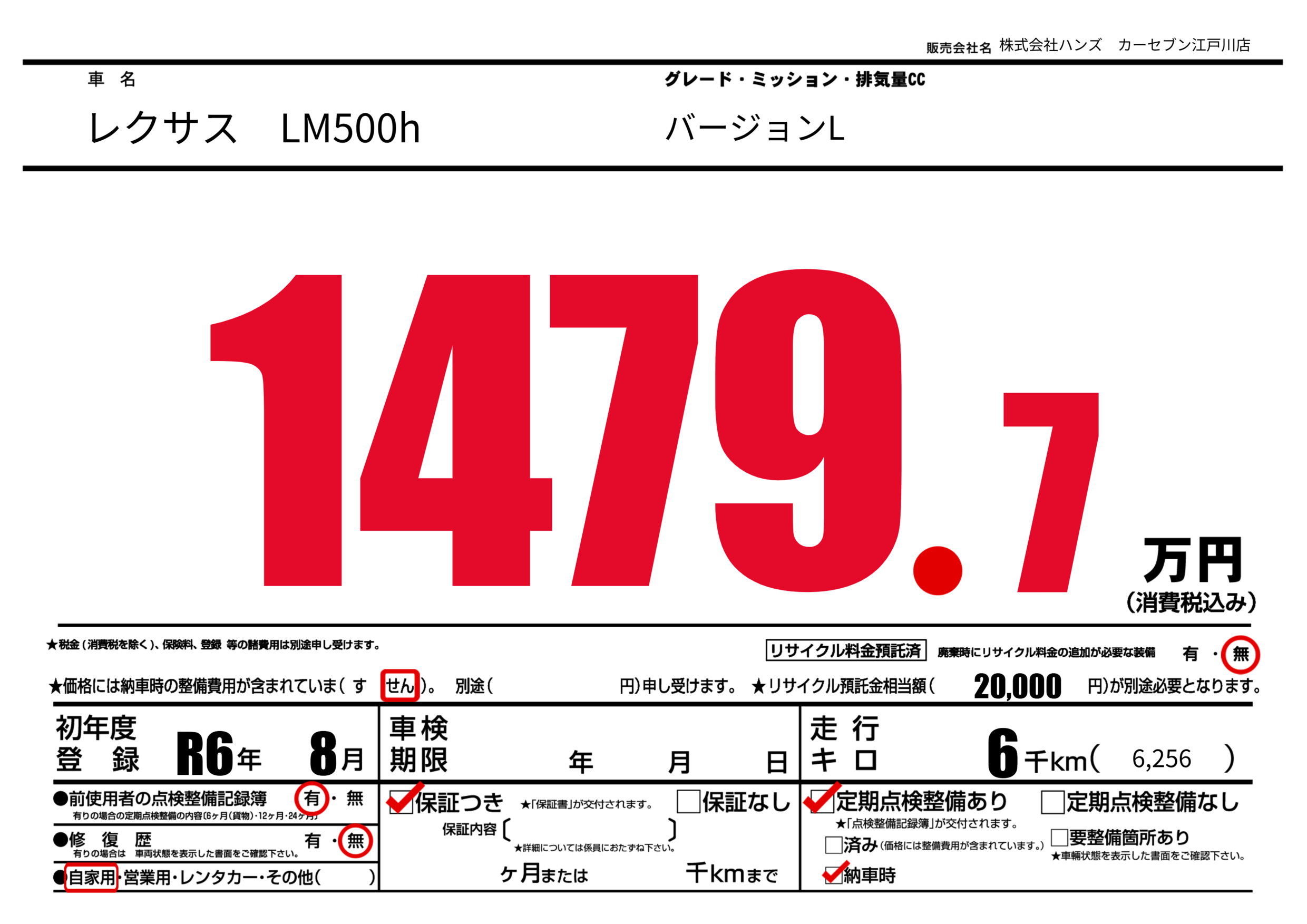 | 走行キロ | 0.6万km | 初年度登録 | R6年8月 |