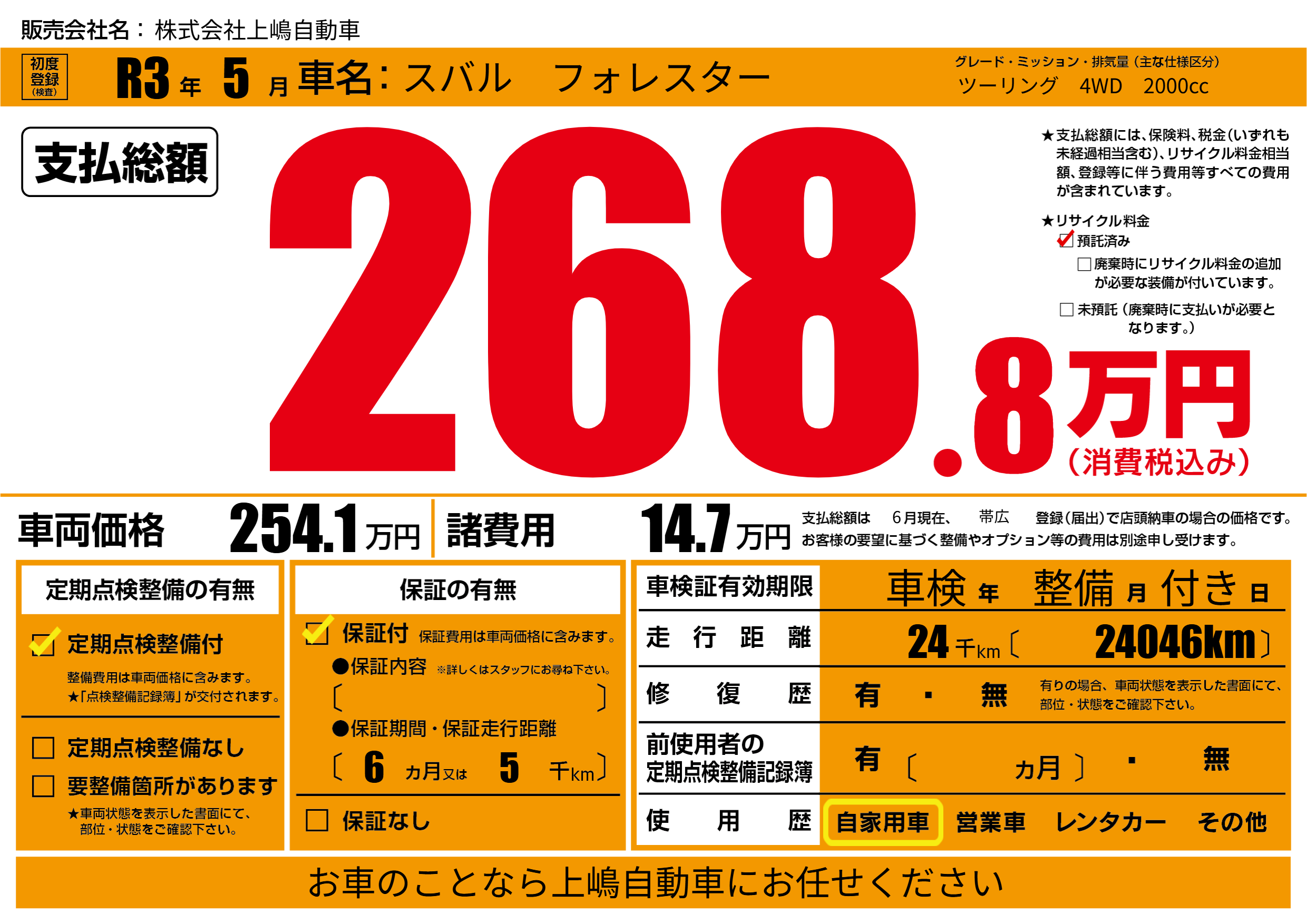 | 車名 | スバル フォレスター | グレード ミッション 排気量 |