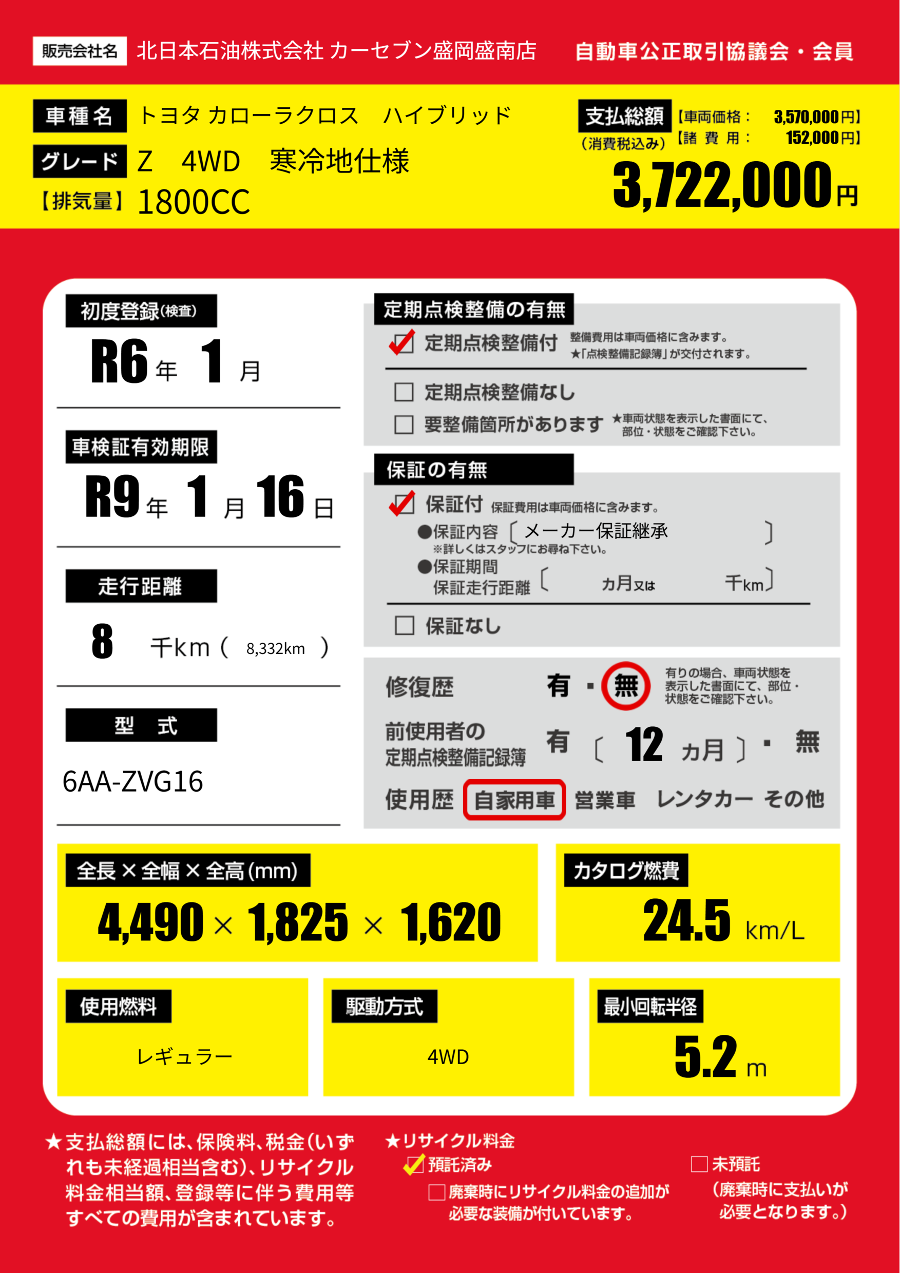 | 車名 | トヨタ カローラクロス ハイブリッド | グレード ミッション 排気量 |