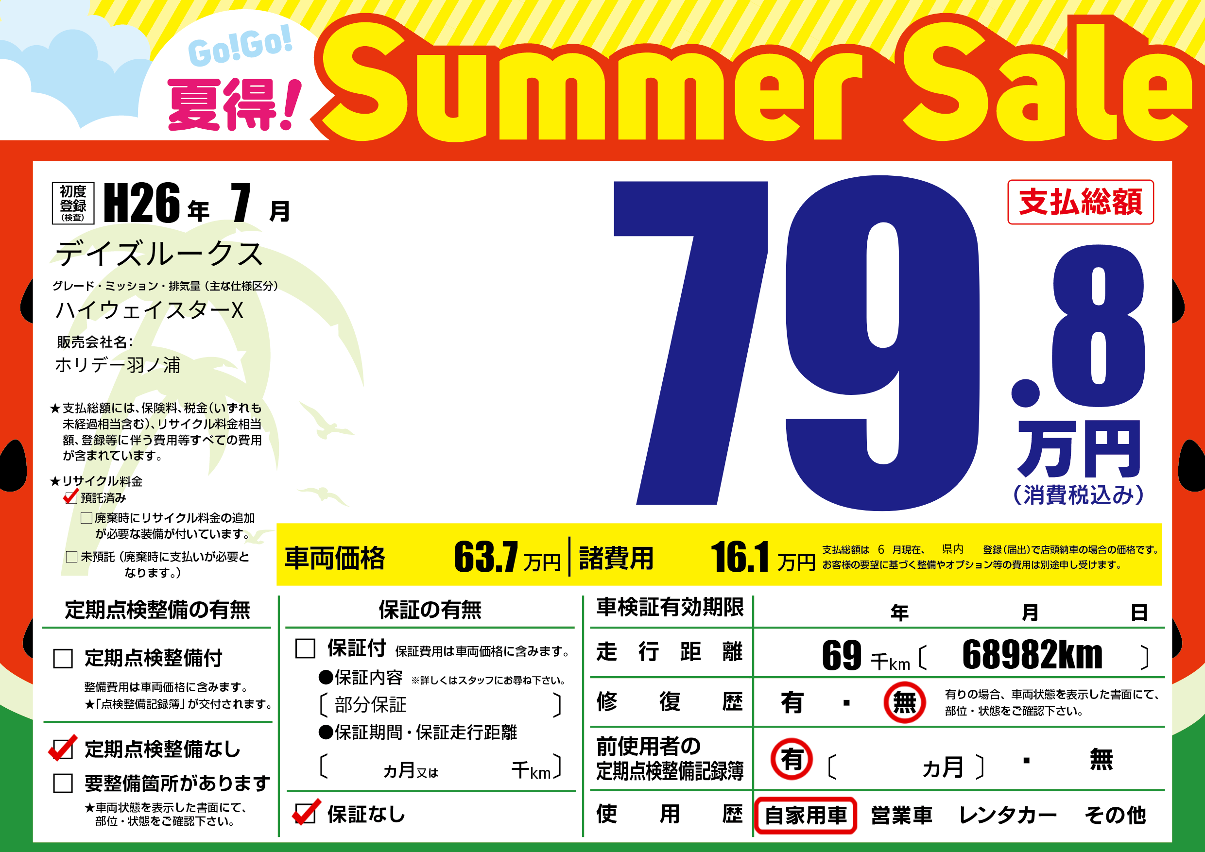| 走行キロ | 6.9万km | 初年度登録 | H26年7月 |
