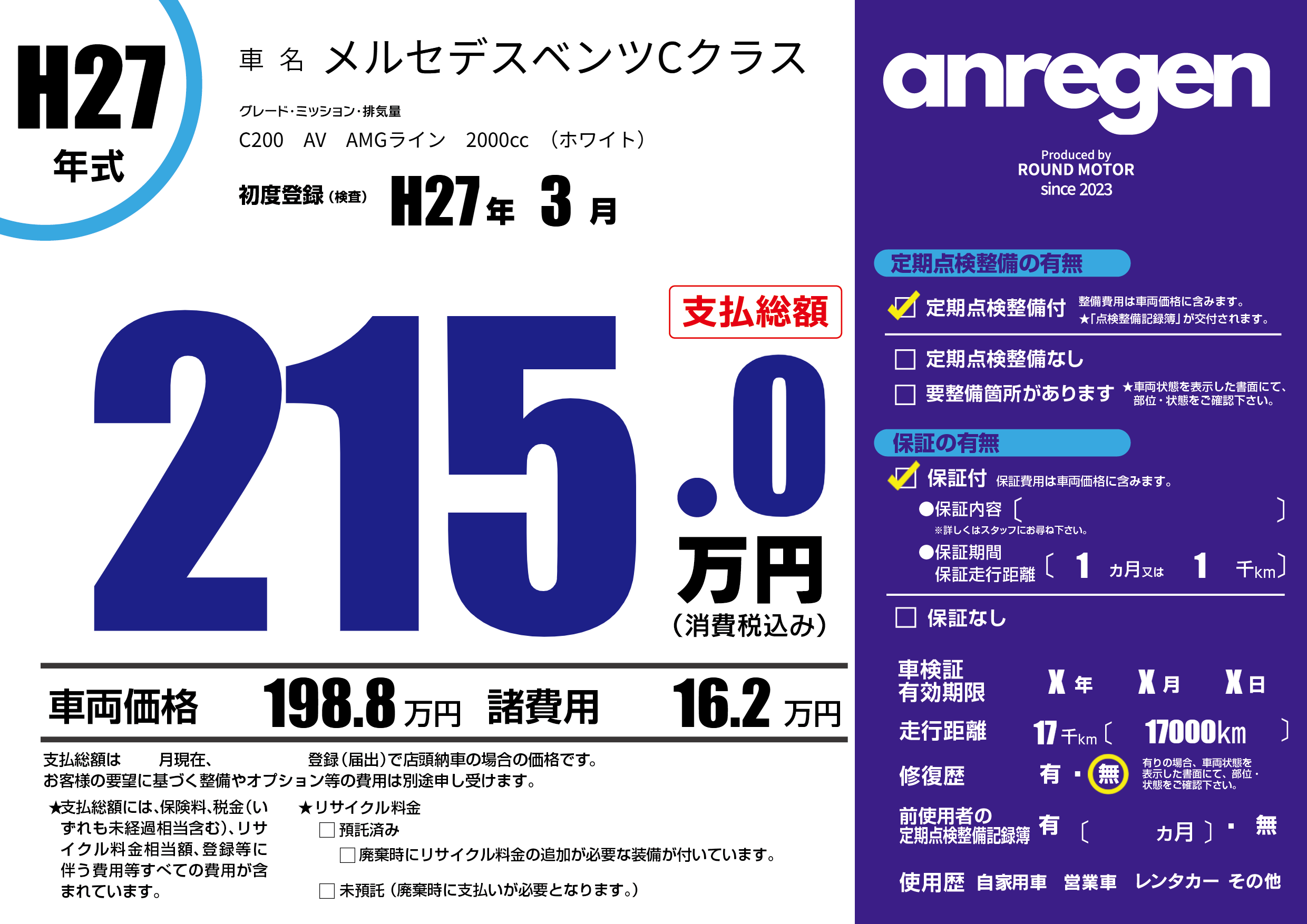 | 車名 | メルセデスベンツCクラス | グレード ミッション 排気量 |