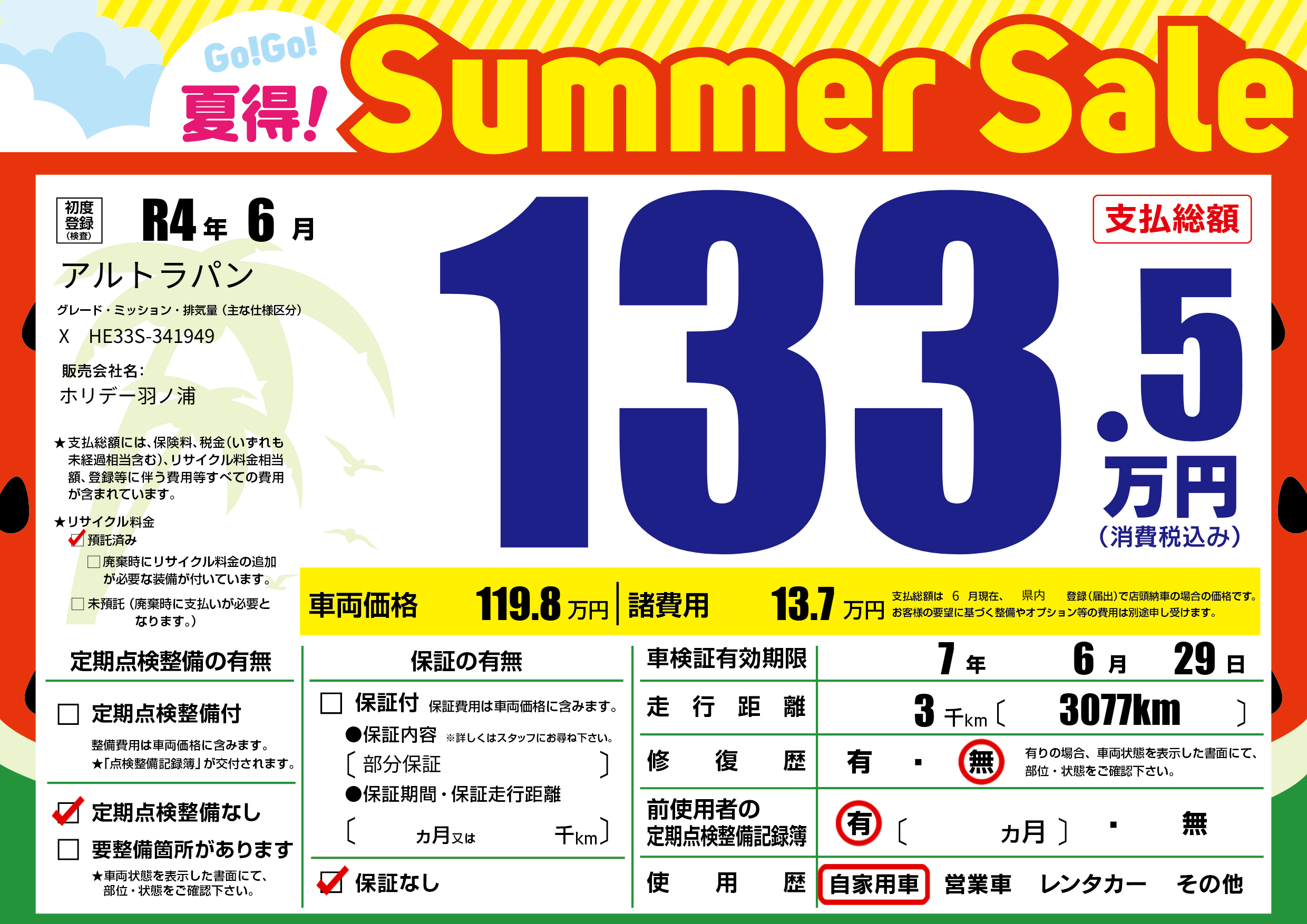 保証なし 保証内容(部分保証) ---ヶ月または()千kmまで |