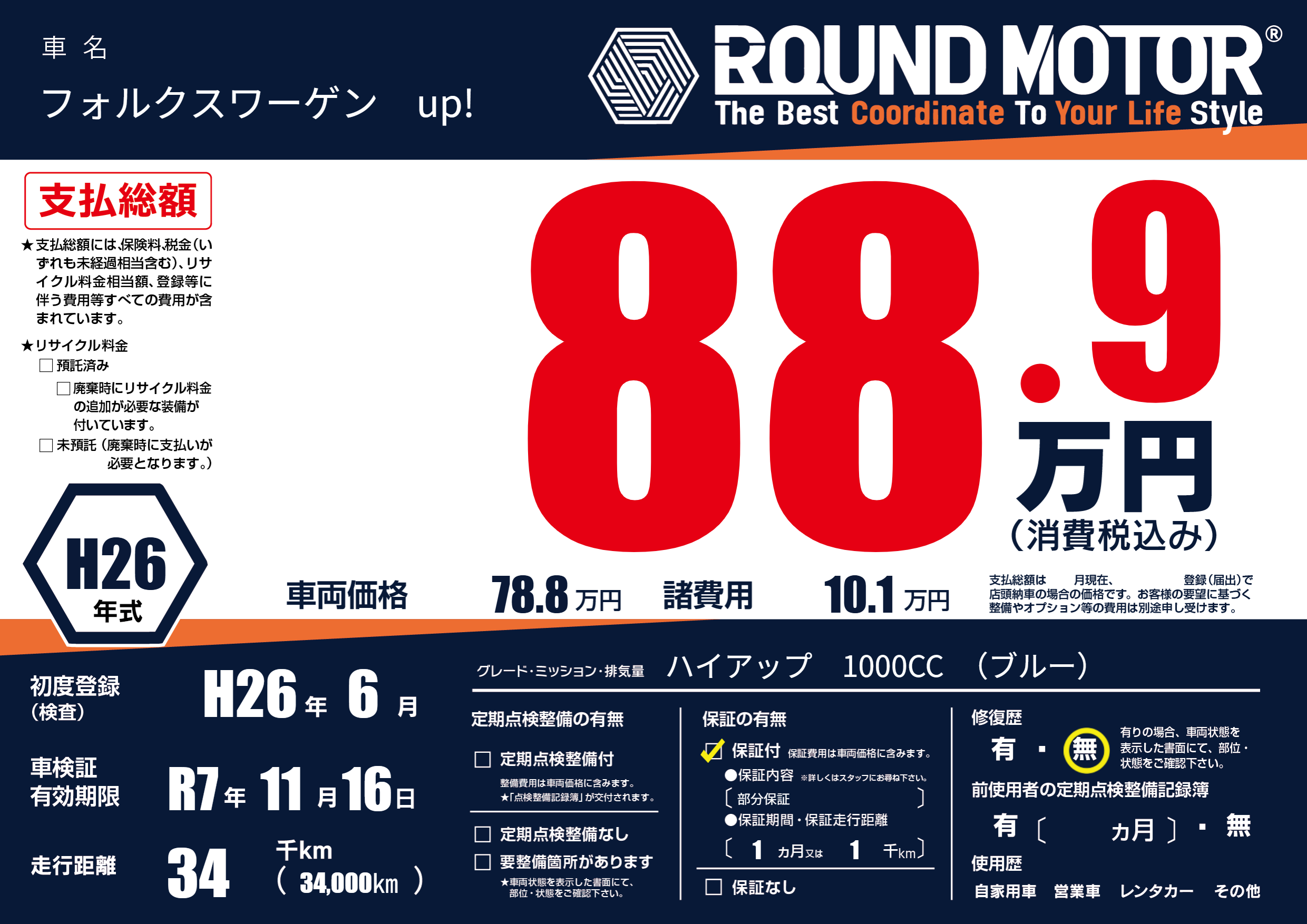 | 車名 | フォルクスワーゲン up! | グレード ミッション 排気量 |